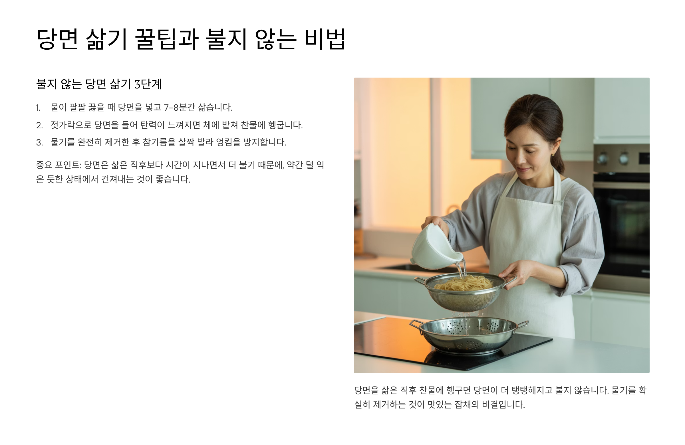 | 당면 | 미지근한 물에 30분 이상 불림 | 불려서 부드럽게, 과도한 삶기 금지 |