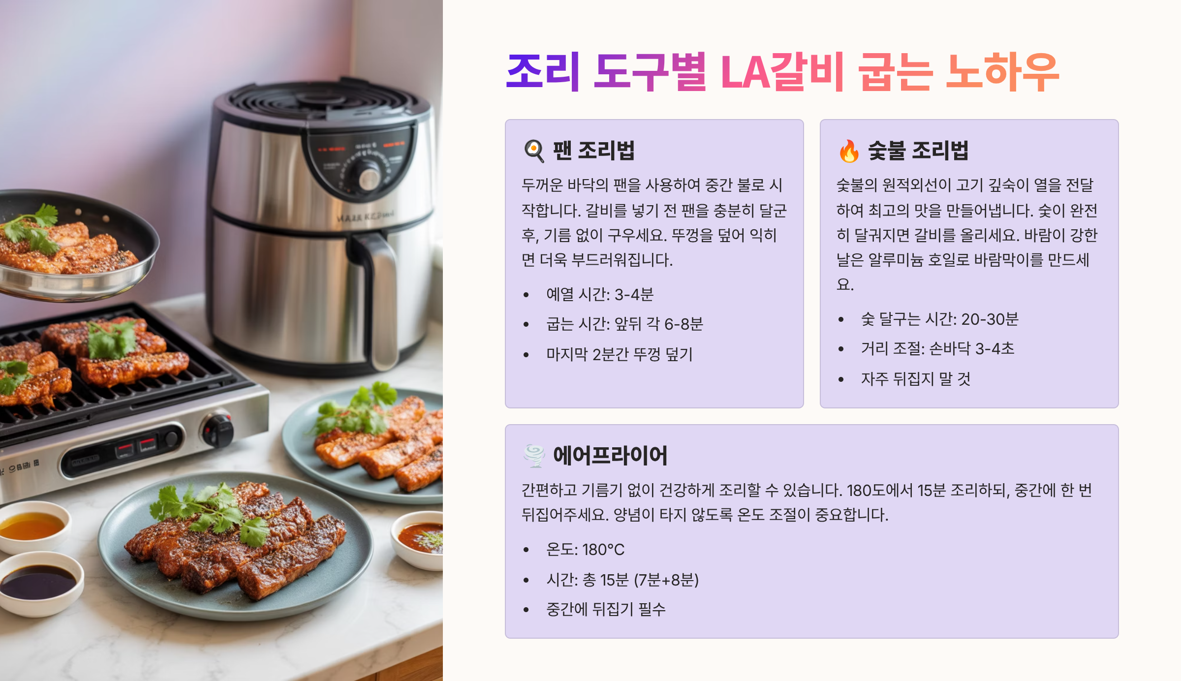 LA갈비는 조리 도구에 따라 맛과 식감이 크게 달라집니다. 가장 일반적인 프라이팬 구이는 위 3단계 불 조절법을 따르면 되지만, 숯불이나 최근 인기가 높은 에어프라이어를 사용할 때는 별도의 노하우가 필요합니다. **숯불 구이**는 단연 최고의 풍미를 선사하지만, 양념이 가장 잘 타는 환경이기도 합니다. 따라서 숯불에 직접 굽기 전, 고기를 중불 팬에 80% 정도 익혀준 후, 마지막에 숯불에 빠르게 뒤집으며 '불향'만 입혀주는 것이 타지 않고 맛있게 굽는 비법입니다. 에어프라이어는 편리하지만 건조해지기 쉬우므로 촉촉함을 유지하는 것이 중요합니다.