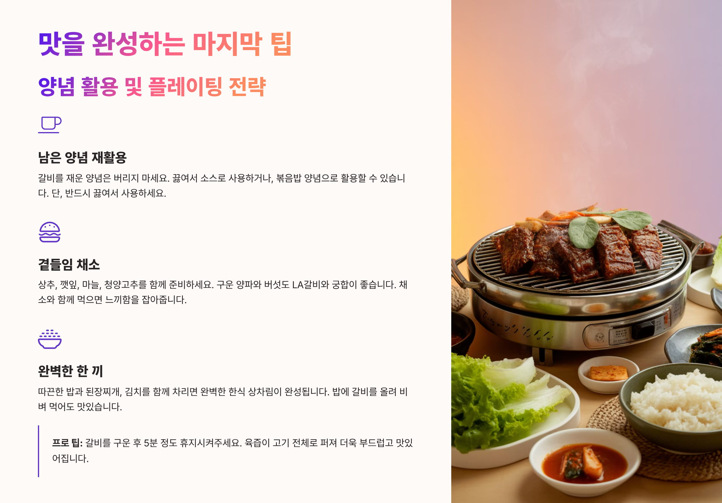 Q1: **LA갈비 맛있게 굽는법**의 핵심 비결은 무엇인가요?