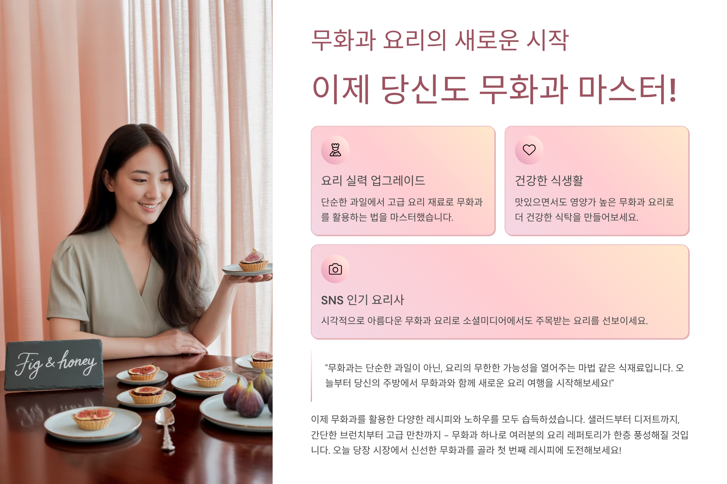 지금까지 **무화과 요리**의 최신 트렌드부터 **무화과 레시피**, 그리고 **무화과 효능**까지 깊이 있게 알아보았습니다. 무화과는 활용도가 높아 생과일로 즐기든, 샐러드나 샌드위치, 잼 등 다양한 형태로 즐기든 항상 새로운 미식 경험을 선사합니다. 이 가이드를 통해 얻은 정보를 바탕으로 제철 무화과를 활용한 건강하고 맛있는 요리를 즐겨보시기 바랍니다. 혹시 나만의 특별한 **무화과 요리** 노하우가 있다면 댓글로 나눠주세요! 😊
