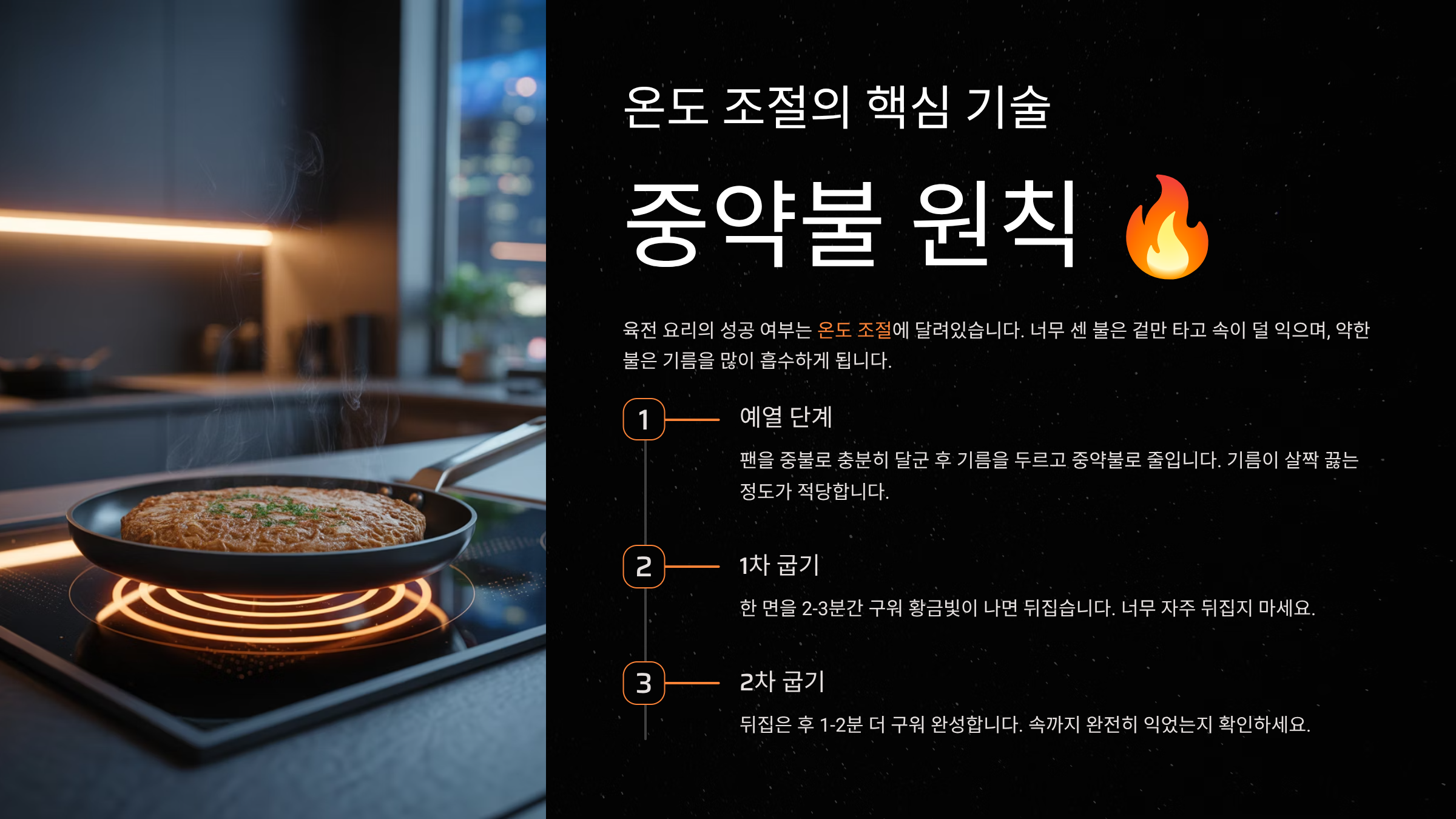 4. 중약불 원칙! 육전을 부치는 전문가의 온도 조절 기술 🔥