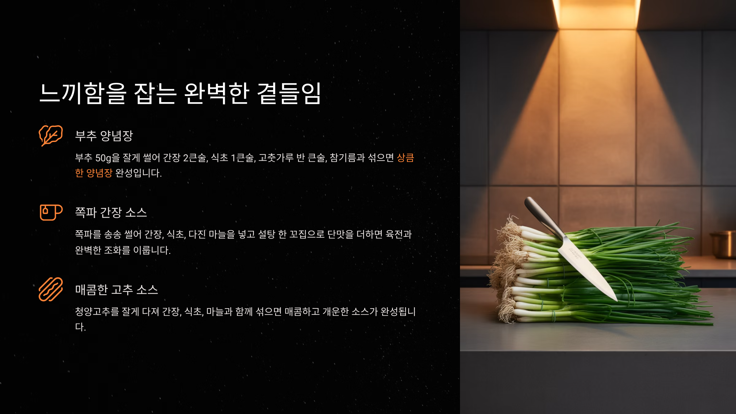 부추나 쪽파가 없다면, 대파를 얇게 채 썰어 **파절이**를 만들고 위 소스에 무쳐보세요. 톡 쏘는 파의 향이 육전의 맛을 더욱 돋우어 줍니다. 청양고추를 소량 다져 넣으면 매콤함이 배가됩니다.