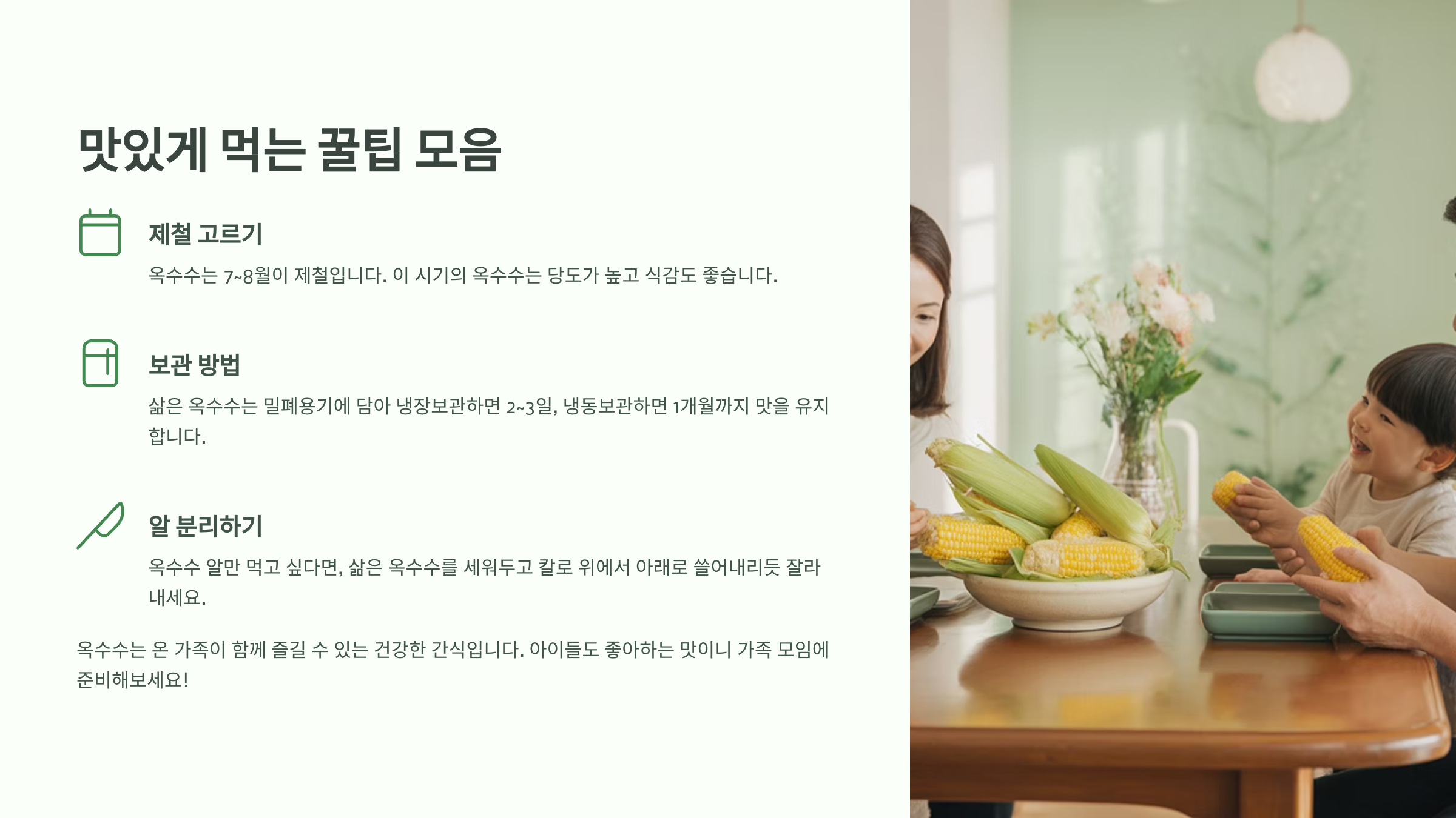 작은 팁들이 모여 옥수수를 더 맛있고 다양하게 즐길 수 있게 해줘요. 저는 이 꿀팁들 덕분에 옥수수를 자주 삶고 가족들과 나눠 먹는 즐거움을 더할 수 있었답니다. 여러분도 한번 활용해 보세요!