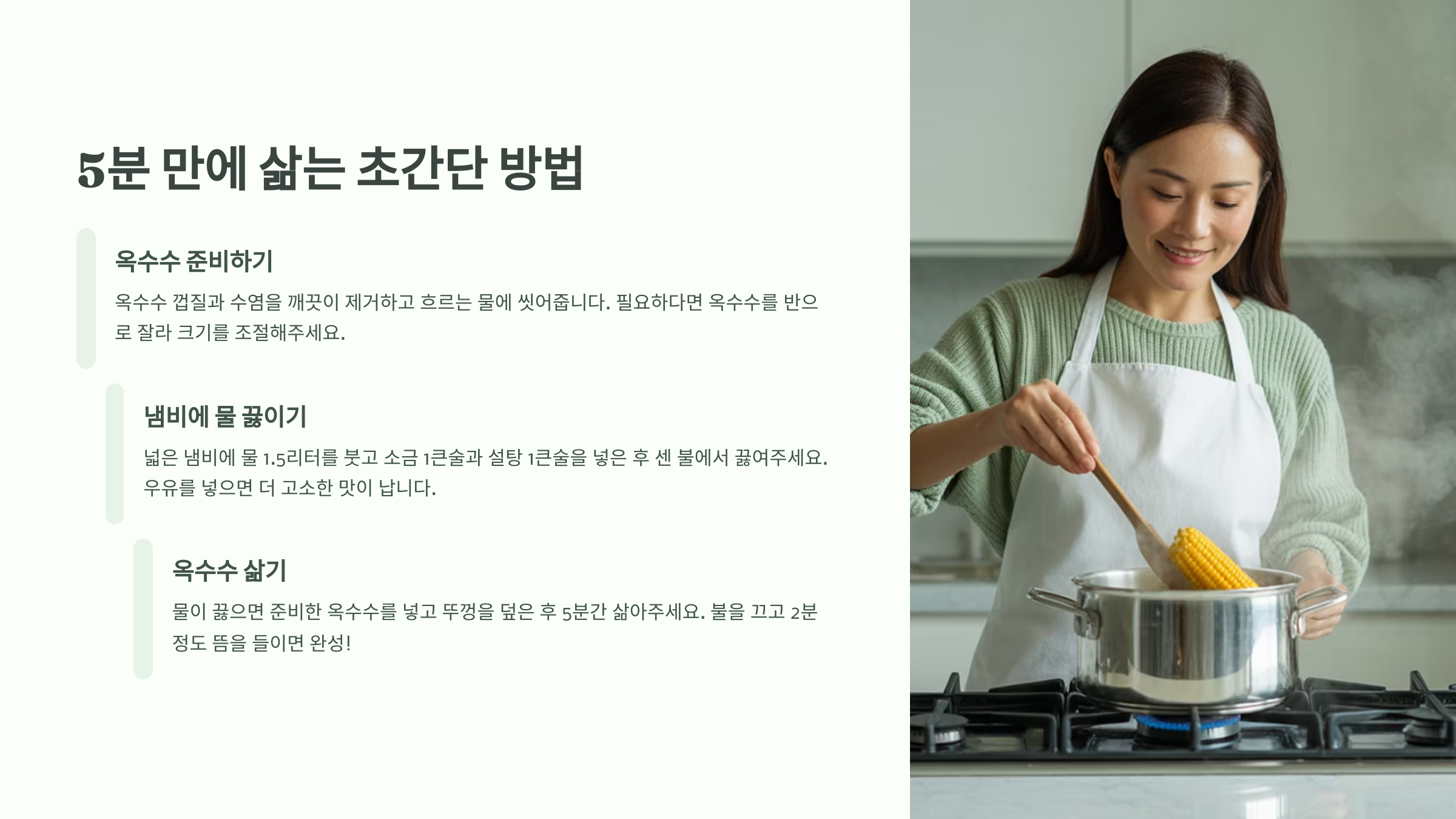 기본적으로 옥수수를 삶을 때는 시간과 신선도, 물의 양, 소금 사용이 맛에 크게 영향을 미쳐요. 그래서 저는 5분 만에 삶는 황금 레시피를 중심으로 소개할 건데, 이 방법이 시간도 절약되고 맛도 좋아서 많은 분께 추천하고 싶어요.