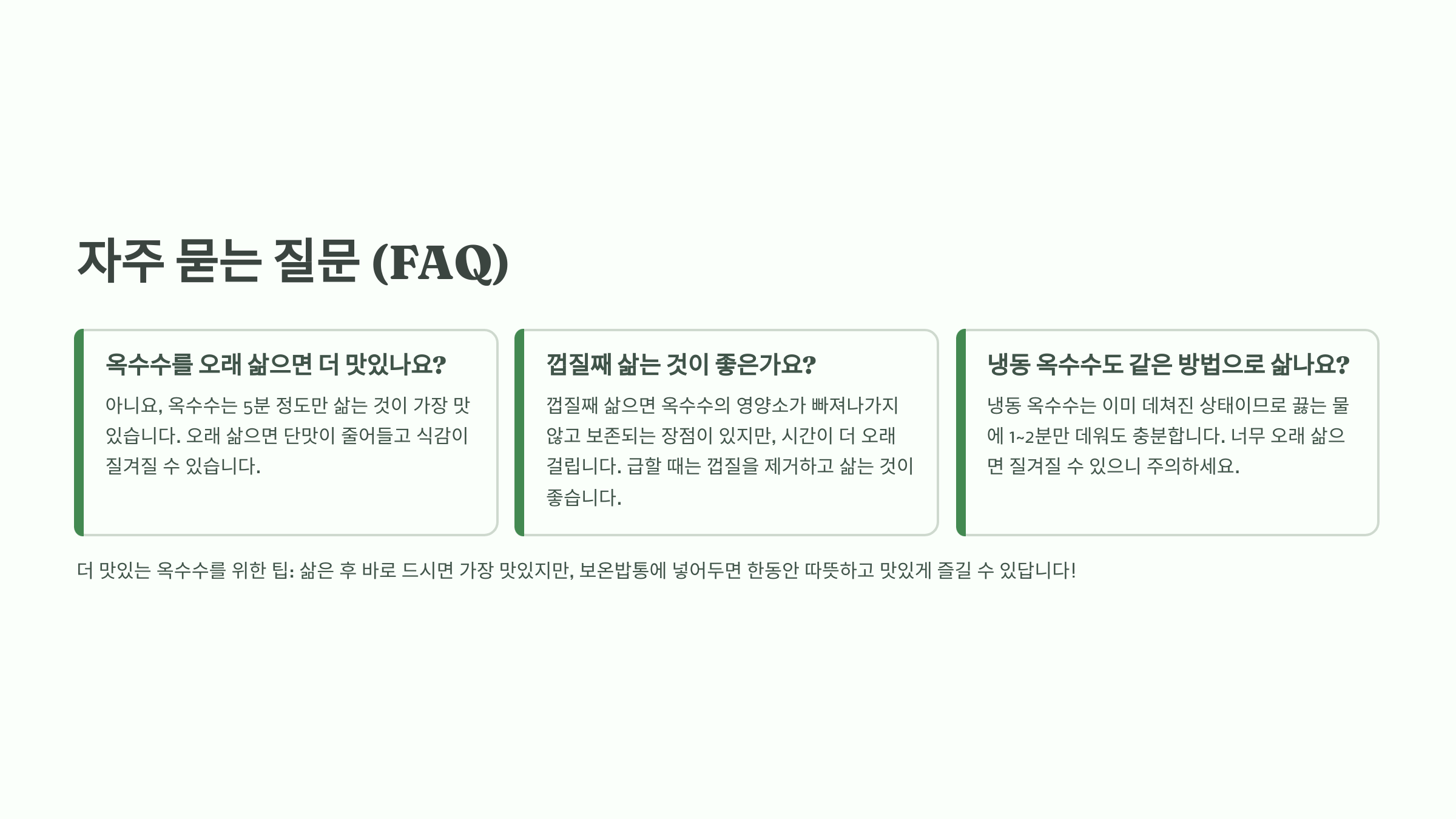 | 5분 삶기 | 5분 + 뜸 들임 3분 | 아삭하고 달콤 | 시간 절약, 신선함 유지 | 두꺼운 옥수수는 조금 단단 |