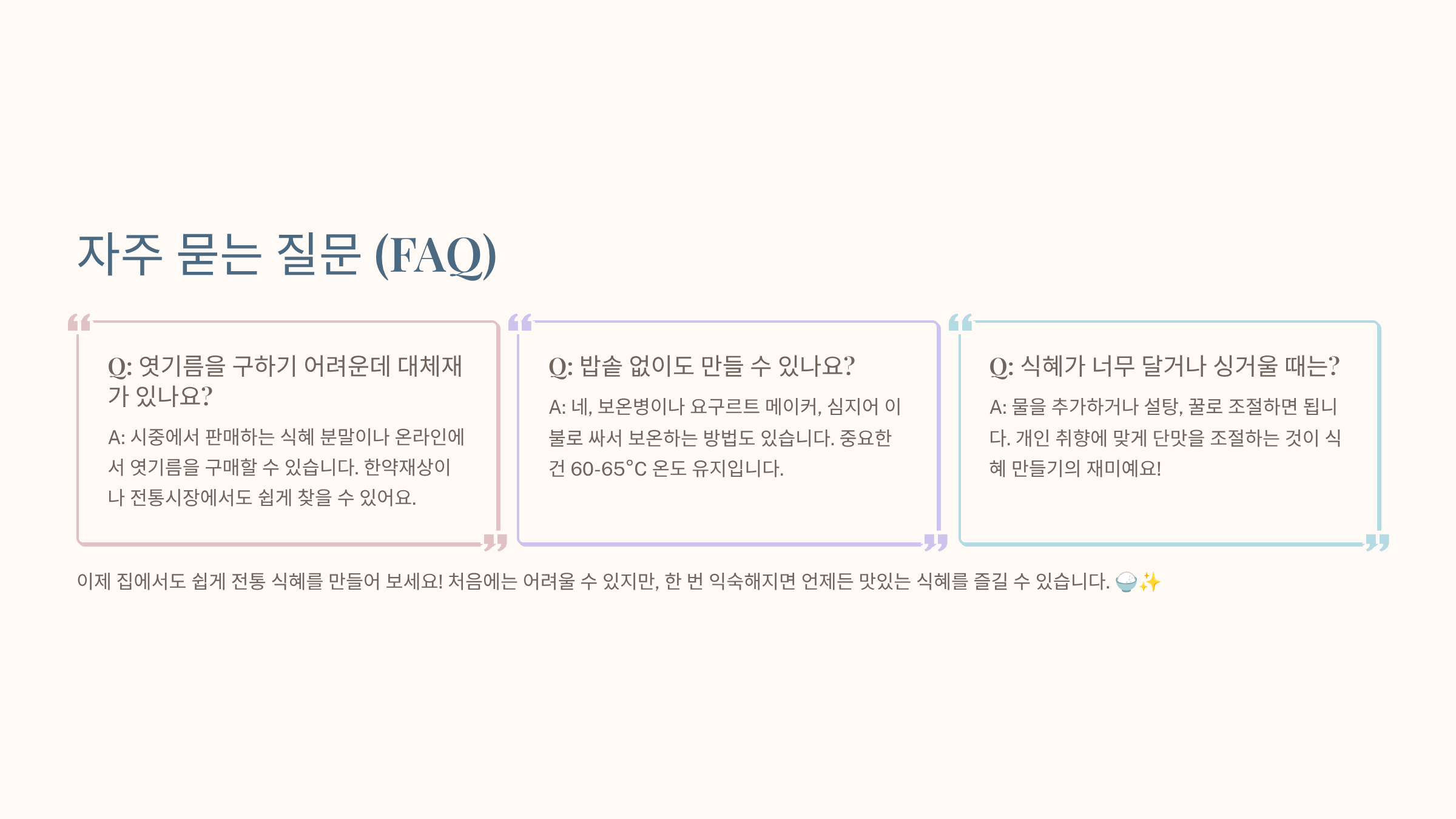 식혜 만들기에 대해 더 궁금한 점이나 여러분만의 노하우가 있다면 댓글로 자유롭게 나눠주세요!