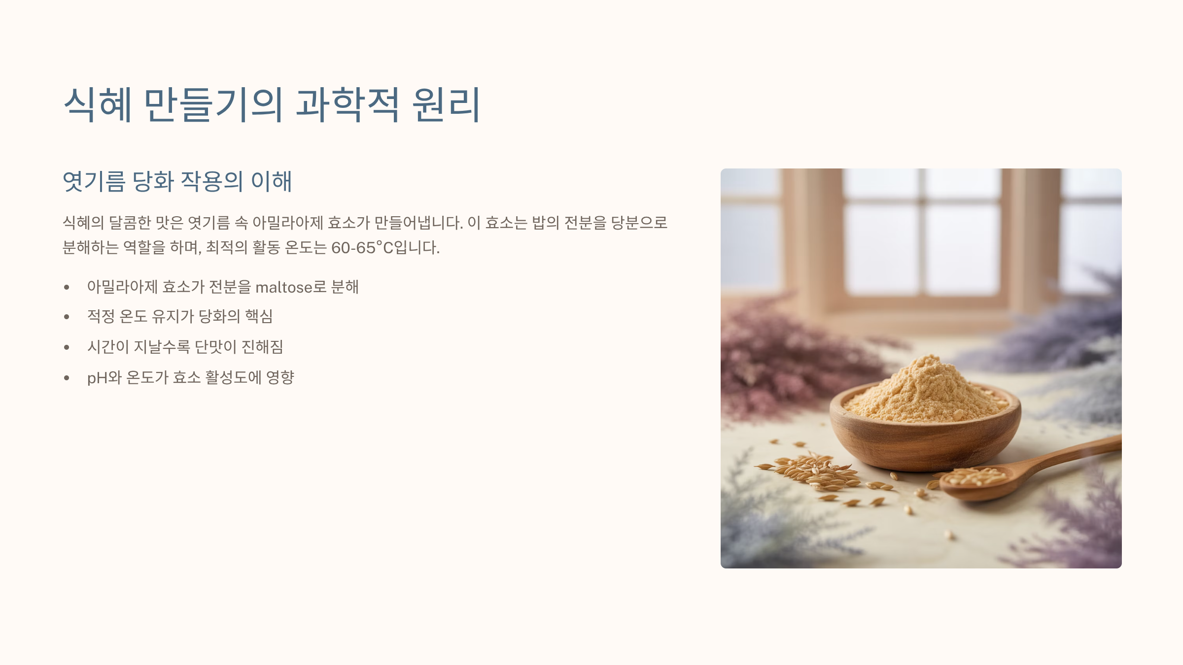 **전문성 확보:** 엿기름 효소의 당화는 pH 5.0~5.6의 약산성 환경에서 활성이 더 높아집니다.