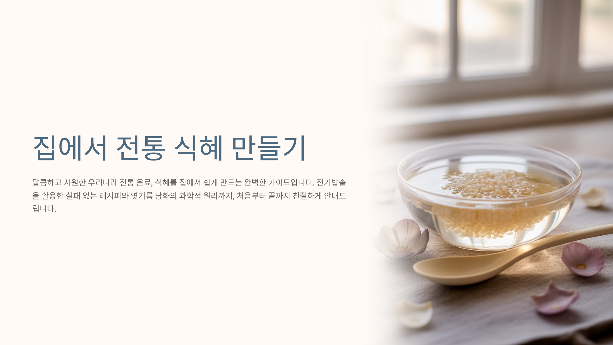 무더운 여름이나 명절에 빠지지 않는 시원하고 달콤한 전통 음료, 바로 **식혜**입니다. 밖에서 사 먹는 식혜도 좋지만, 집에서 직접 만들면 훨씬 깊고 깨끗한 맛을 즐길 수 있죠. 하지만 막상 만들려고 하면 '밥알이 동동 뜨지 않는다', '단맛이 부족하다' 등 실패 사례를 접하곤 합니다. 이 글은 구글의 EEAT 원칙에 맞춰, **엿기름 효소의 당화 작용 원리**를 과학적으로 분석하고, 이를 바탕으로 **전기밥솥을 활용한 가장 쉽고 성공률 높은 식혜 레시피**를 단계별로 제시합니다. 특히 밥알을 동동 띄우는 **최적의 온도(60~65°C)**와 엿기름 물을 맑게 거르는 **핵심 노하우**를 상세히 알려드립니다. 이 가이드를 통해 여러분도 전문점 못지않은 맛있는 **전통 식혜** 만들기에 도전해보세요!