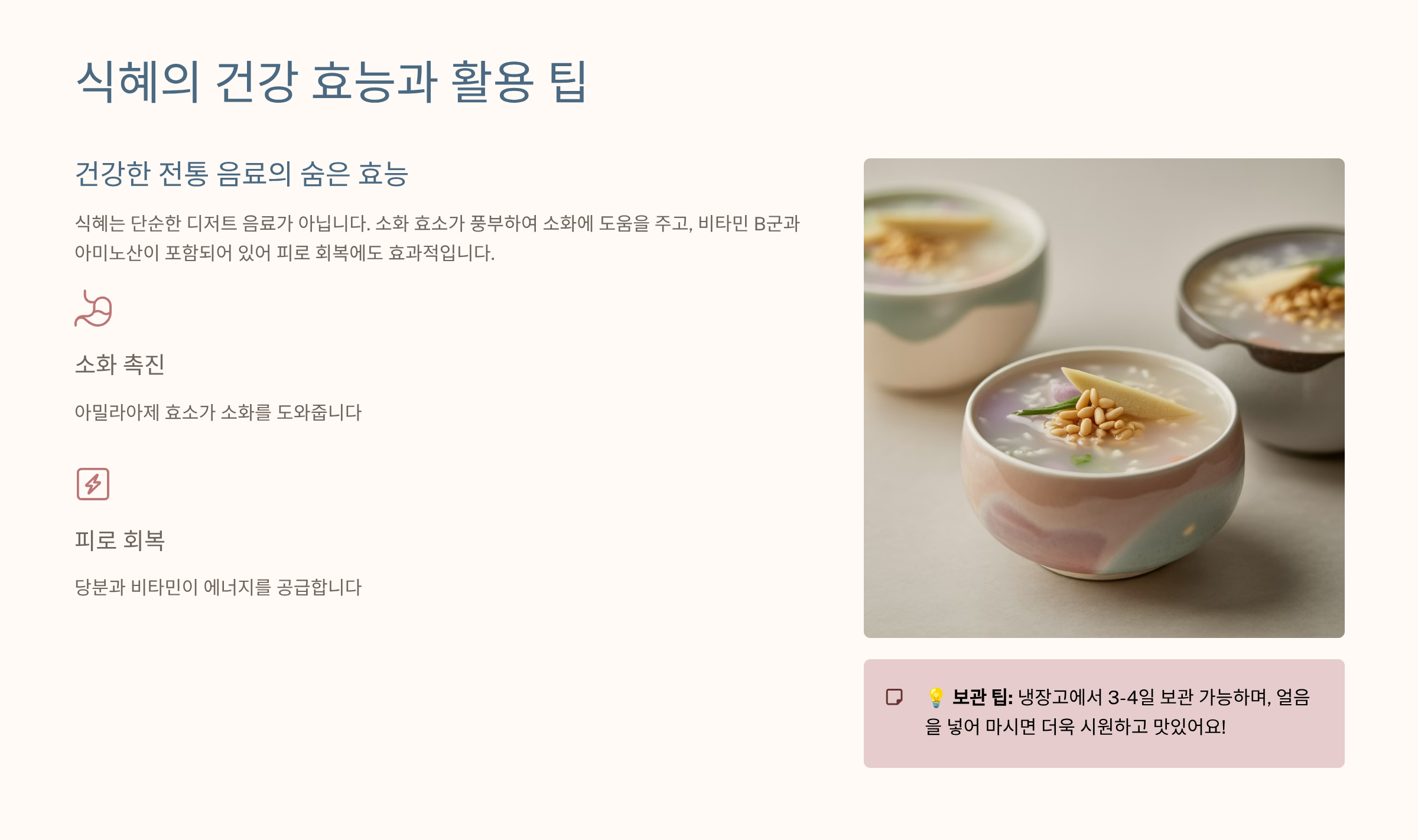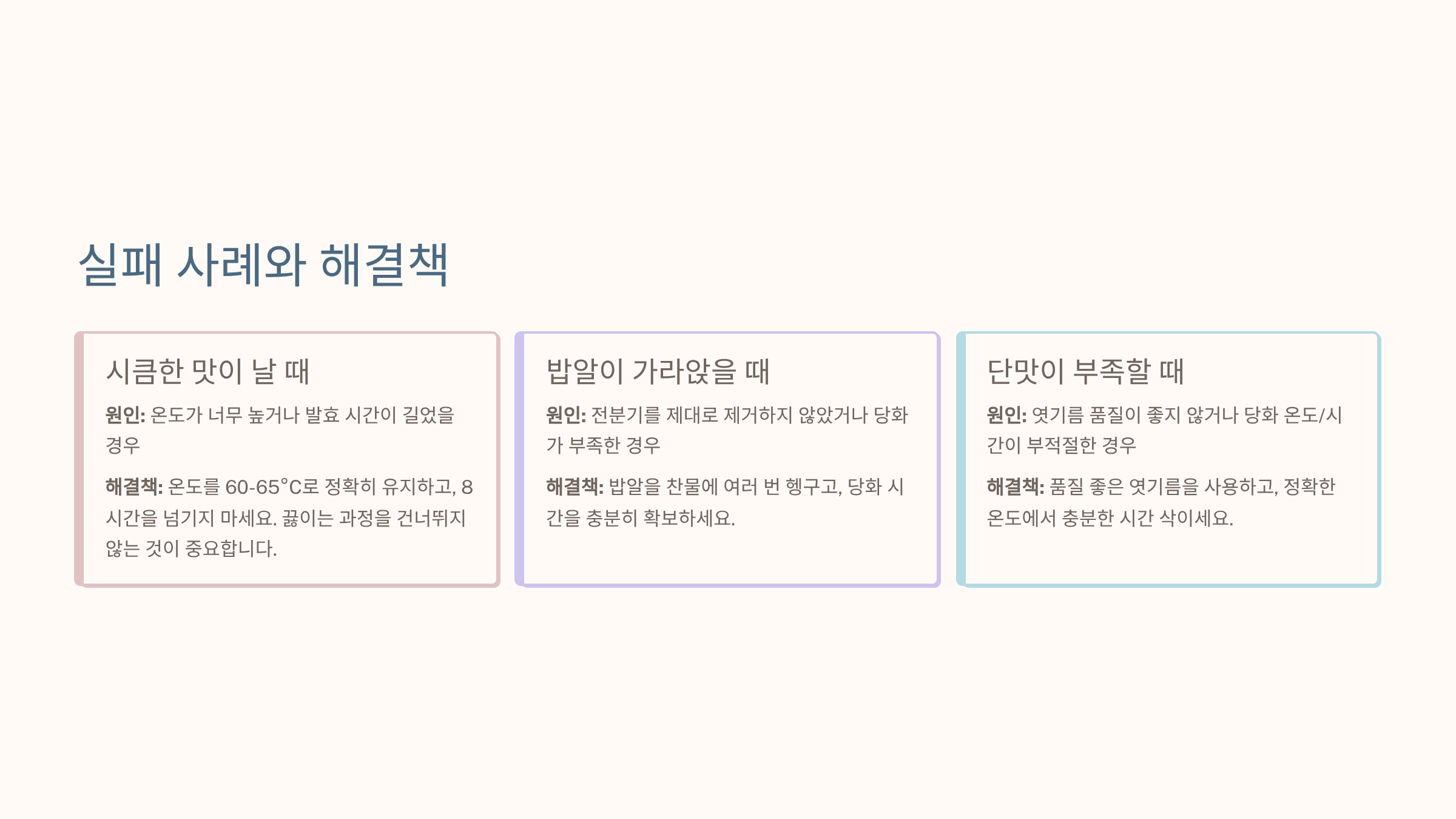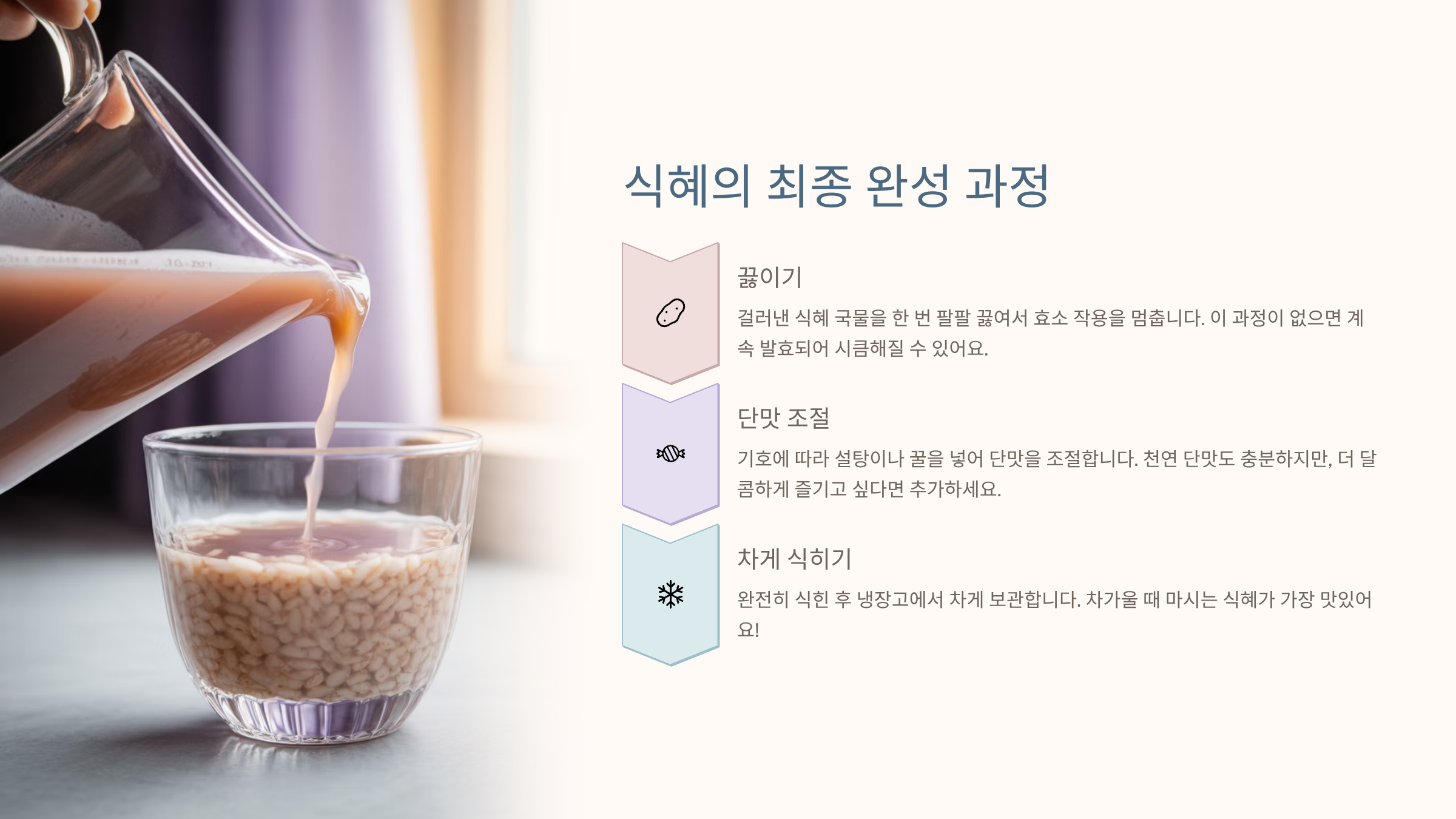 집에서 **식혜 만드는 방법**을 시도할 때 가장 흔하게 겪는 두 가지 실패는 **시큼한 맛**과 **밥알이 가라앉는 현상**입니다. 시큼한 맛은 당화가 아닌 **세균에 의한 발효**가 진행되었음을 의미하며, 이는 주로 삭히는 온도가 너무 높거나(70°C 이상), 삭히는 시간이 지나치게 길었을 때(8시간 이상) 발생합니다. 전기밥솥의 보온 기능이 너무 뜨겁다면, 뚜껑을 살짝 열어두어 온도를 조절해줘야 합니다. 밥알이 가라앉는 현상은 4번 섹션에서 강조했듯이 **밥알의 전분기가 충분히 제거되지 않았거나**, 밥알을 헹군 후 식혜 국물과 함께 보관했기 때문입니다. 밥알은 깨끗이 헹궈서 따로 보관했다가, 완전히 차가운 식혜 국물 위에 소량만 띄워주는 것이 해결책입니다. 이 두 가지 핵심 실패 요인만 정확히 파악하고 수정하면 누구나 깔끔하고 맛있는 식혜 만들기에 성공할 수 있습니다.