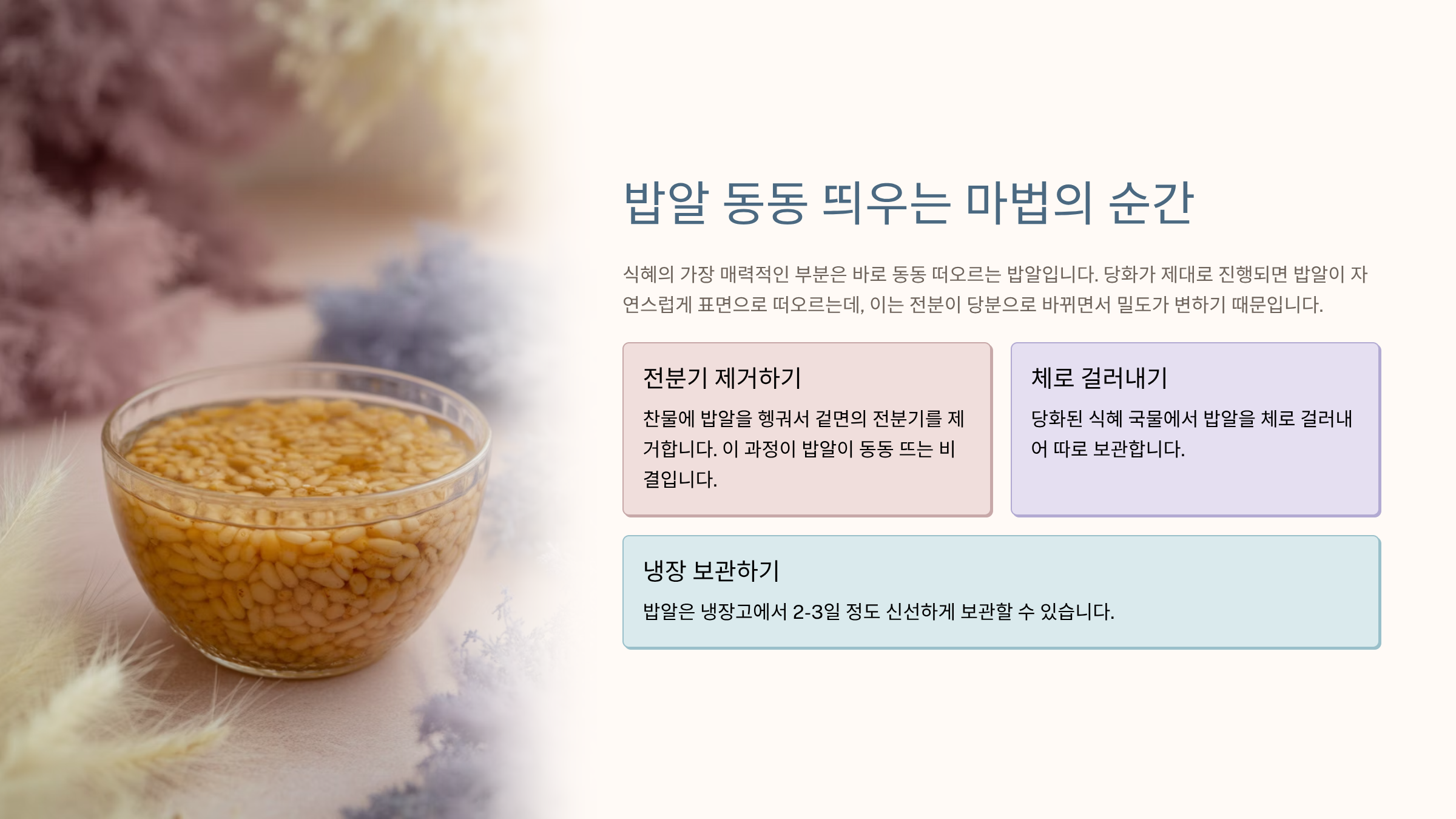 **전문성 확보:** 밥알이 뜬 후에도 계속 삭히면 산패(시큼한 맛)가 진행되므로 타이밍이 중요합니다.