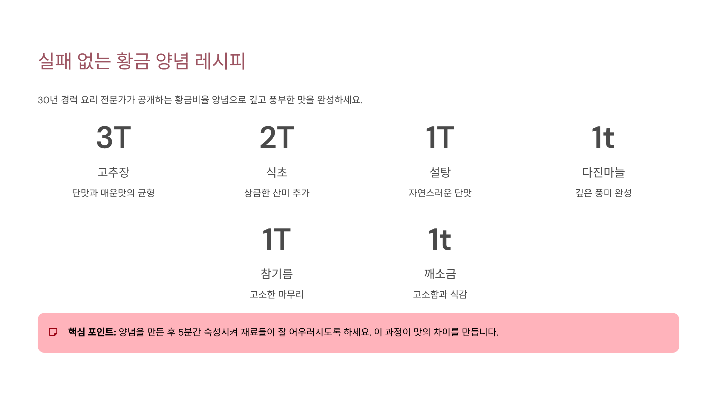 A: 👉 네, **고추장의 맛(매운맛, 단맛, 염도)**이 전체 양념 맛의 30% 이상을 좌우합니다. 선호하는 맛의 고추장을 사용하는 것이 중요합니다.