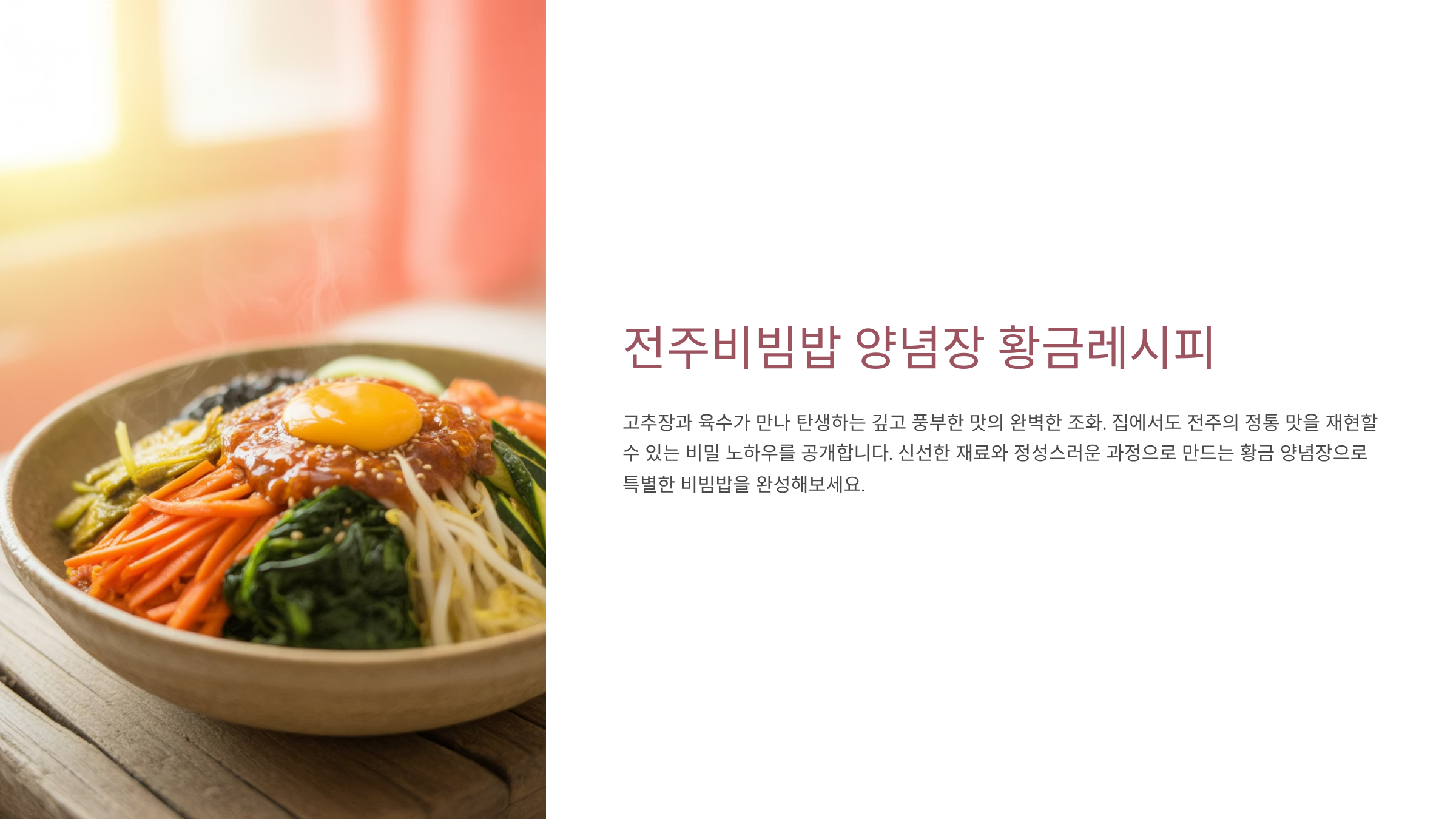 전주비빔밥은 단순한 음식을 넘어 한국의 맛과 정성을 담은 문화유산입니다. 특히, 그 맛을 좌우하는 핵심은 바로 **양념장**에 있습니다. 제대로 된 전주비빔밥 양념장은 단순히 고추장만 섞는 것이 아니라, 깊은 **쇠고기 육수 베이스**와 엄선된 재료의 조화로 만들어지죠. 이 글에서는 수십 년 동안 전주의 맛을 지켜온 비법을 전수하여, 집에서도 깊고 감칠맛 나는 양념장을 만드는 **황금 비율 레시피**를 공개합니다. 이 레시피 하나면 일반적인 비빔밥도 잊을 수 없는 미식 경험으로 바뀔 수 있습니다. 지금부터 그 비결을 함께 파헤쳐 봅시다!