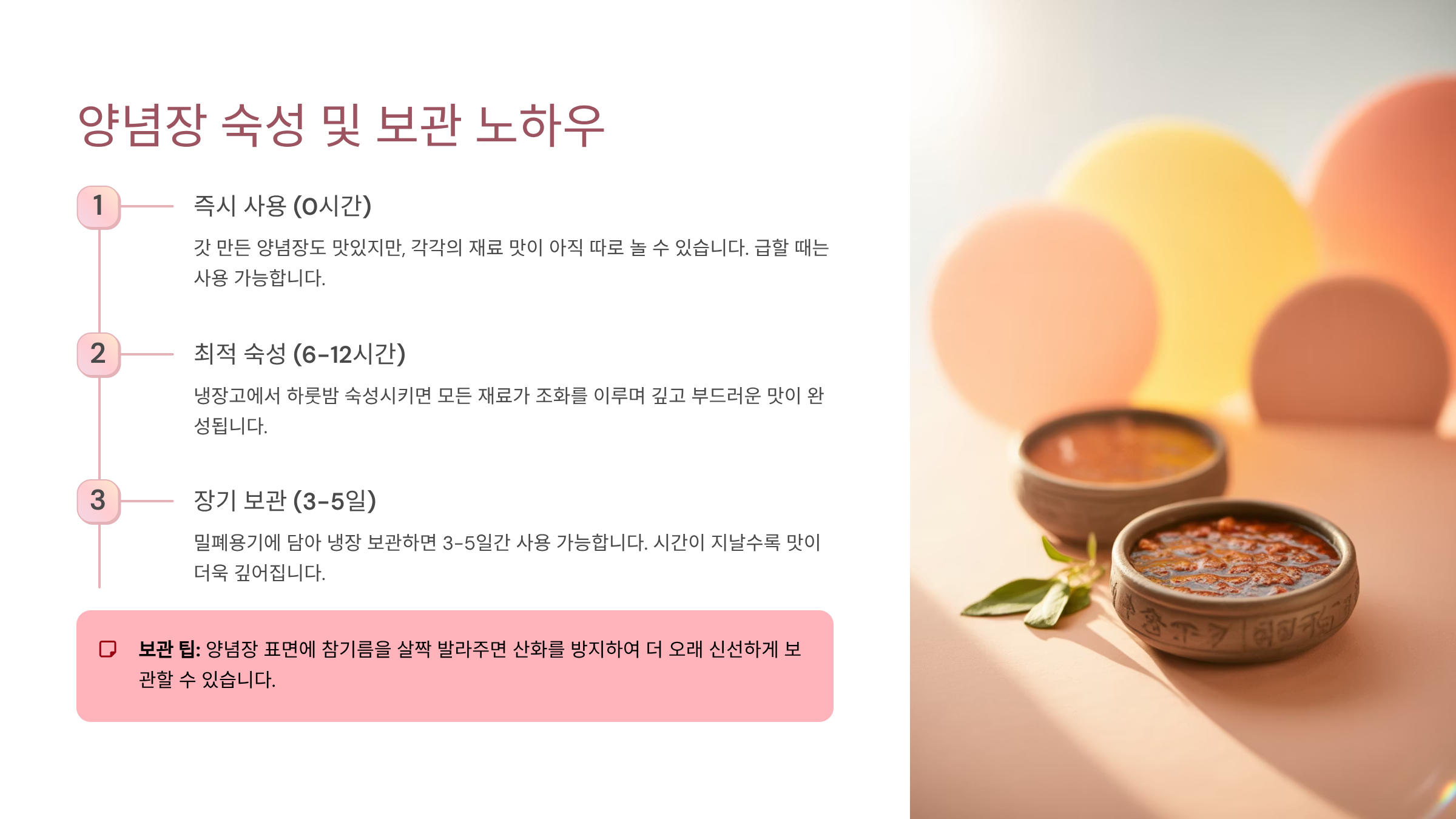 양념장의 맛을 극대화하는 마지막 비법은 바로 **숙성**에 있습니다. 끓여서 완성된 양념장은 즉시 사용하는 것보다, **충분히 식힌 후 하루 정도 냉장 숙성**하는 것이 좋습니다. 숙성 과정은 양념장 속의 모든 재료들이 서로 융화되어 맛의 깊이를 더해주는 결정적인 역할을 합니다. 마치 김치가 익을수록 감칠맛이 깊어지듯, 육장과 고추장의 풍미가 완전히 하나가 되어 더욱 부드럽고 복합적인 맛을 내게 됩니다. 숙성을 거친 양념장은 바로 만들었을 때보다 훨씬 부드럽고, 텁텁함 없이 깔끔한 단맛과 감칠맛을 느낄 수 있습니다. 이 과정은 귀찮을 수 있지만, 진정한 전주비빔밥의 풍미를 원한다면 반드시 지켜야 할 중요한 노하우입니다.