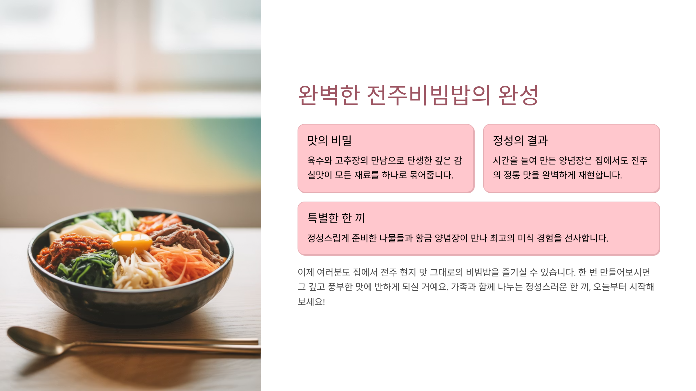 지금까지 전주비빔밥의 핵심인 **황금 양념장 레시피**와 그 노하우를 상세히 살펴보았습니다. 이 레시피의 진정한 가치는 단순히 매운맛을 내는 고추장이 아니라, 깊고 풍부한 **쇠고기 육장**을 베이스로 하여 각 재료가 가진 풍미를 최고로 끌어올린다는 데 있습니다. 육수 준비부터 고추장과의 황금 비율 배합, 그리고 마지막 숙성까지, 이 모든 과정에 정성을 쏟아야만 우리가 기대하는 **전주비빔밥 특유의 깊은 감칠맛과 부드러움**을 완성할 수 있습니다. **시간과 정성**이 곧 맛의 깊이가 되는 전통 한식의 미학이 이 양념장에 고스란히 담겨있는 것이죠. 이 양념장만 있다면, 평범한 집밥도 특별한 미식 경험으로 승화시킬 수 있습니다.