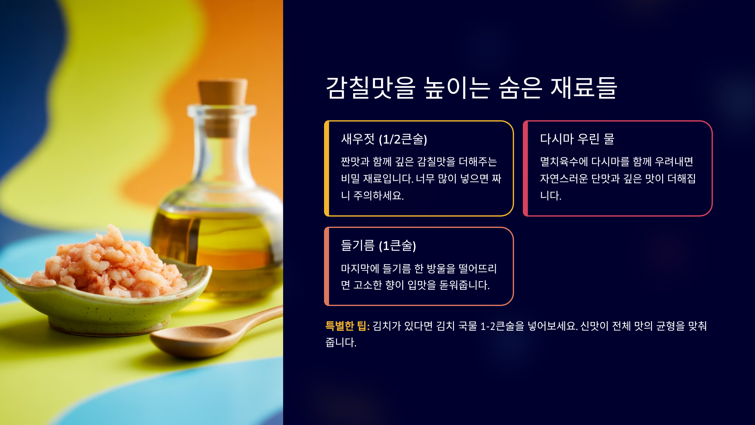 매운 재료의 투입 순서는 맛의 깊이와 향의 신선함을 결정하는 핵심 요소입니다.