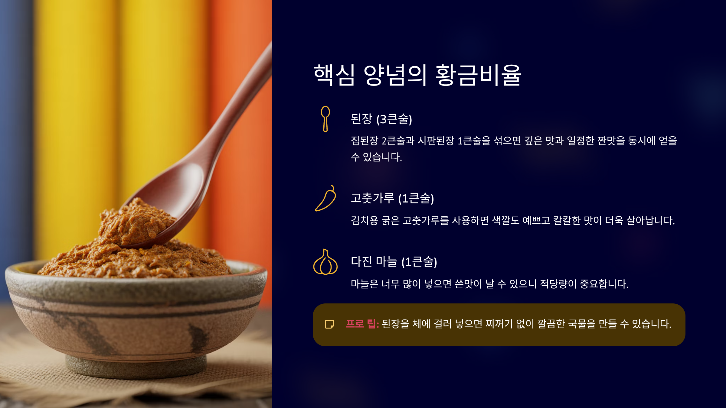 A: 집된장(구수함)과 시판된장(감칠맛/깔끔함)을 1:1 비율로 섞어 사용하는 것이 전문가들이 추천하는 황금비율입니다.