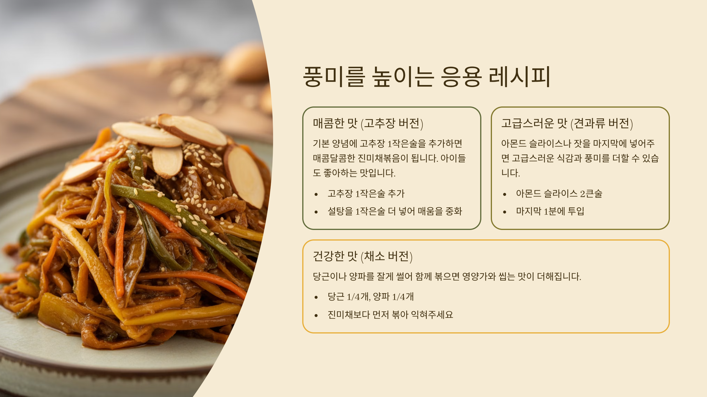 기본 간장 진미채볶음 레시피에 몇 가지 추가 재료를 활용하면 더욱 다채로운 풍미를 즐길 수 있습니다. 특히, 아이들 반찬으로만 여겨지던 간장 진미채볶음을 **어른들의 입맛**까지 사로잡는 반찬으로 업그레이드할 수 있습니다. 가장 쉽게 적용할 수 있는 변화는 **매콤함의 추가**입니다. 양념장을 끓일 때 **청양고추 1~2개를 채 썰어** 함께 볶거나, 아주 소량의 **고춧가루(1/2t 이내)**를 넣어 은은한 매콤한 맛을 더하면 단맛과 짠맛의 느끼함을 잡아줍니다. 또한, **볶은 견과류(아몬드 슬라이스, 호두 분태)**를 마지막에 추가하면 고소한 풍미와 함께 씹는 즐거움(크런치함)이 더해져 식감이 풍부해집니다. 마지막으로, 일반 간장 대신 **조선간장(국간장)을 1/2T 정도 섞어** 사용하면 감칠맛이 폭발적으로 증가하는 효과를 얻을 수 있습니다.