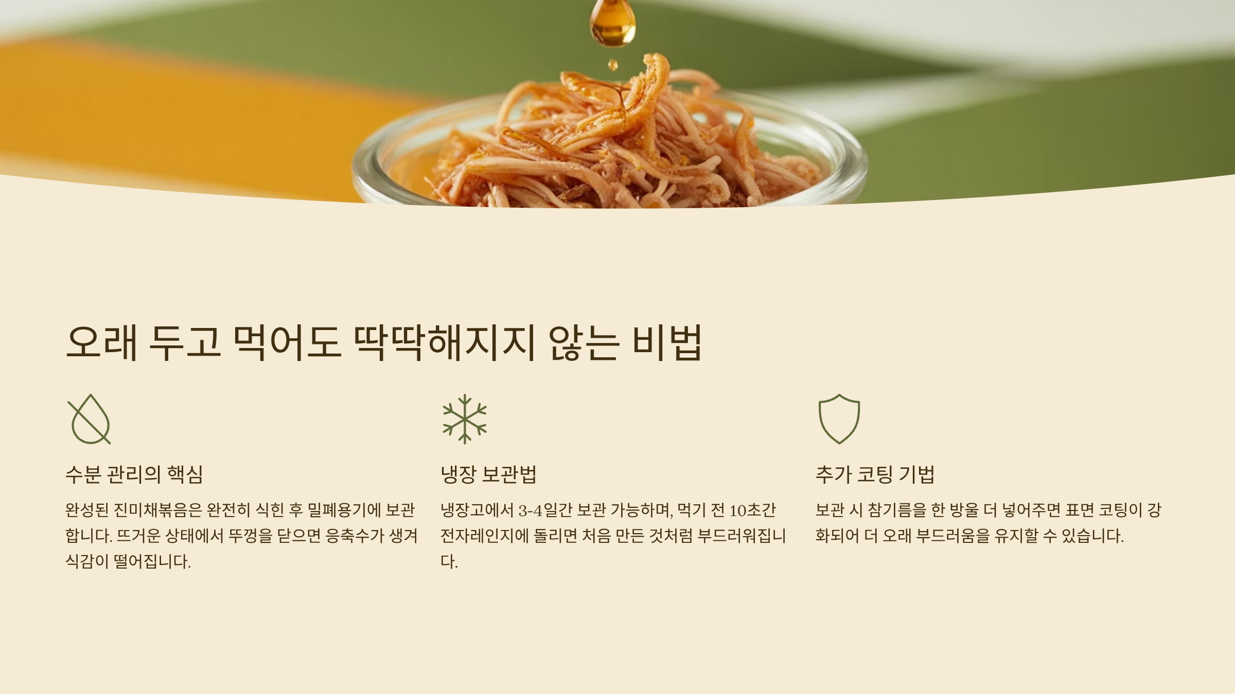 진미채볶음은 냉장고에 보관하면 수분이 빠져나가 딱딱해지기 쉽습니다. 이를 방지하는 노하우는 **마지막 단계의 '물엿/올리고당' 사용**과 **'보관 환경 조성'**에 있습니다. 조리 마지막, 불을 끈 상태에서 진미채와 양념장이 고루 섞인 후 **올리고당(혹은 물엿) 2큰술과 참기름/통깨**를 넣고 빠르게 버무려줍니다. **올리고당은 설탕보다 점성이 높고 수분을 끌어당기는 성질**(보습성)이 강해 진미채 표면에 **코팅막**을 형성하고 내부의 수분이 빠져나가는 것을 효과적으로 막아줍니다. 또한, 마요네즈 코팅을 먼저 했기 때문에 이 코팅층이 2차적으로 수분 방패 역할을 합니다. 보관 시에는 **밀폐 용기**에 담아 **냉장실 중단**에 두는 것이 좋으며, 혹시 딱딱해졌다면 전자레인지에 **10초 정도만** 짧게 돌려주면 다시 부드러워집니다.