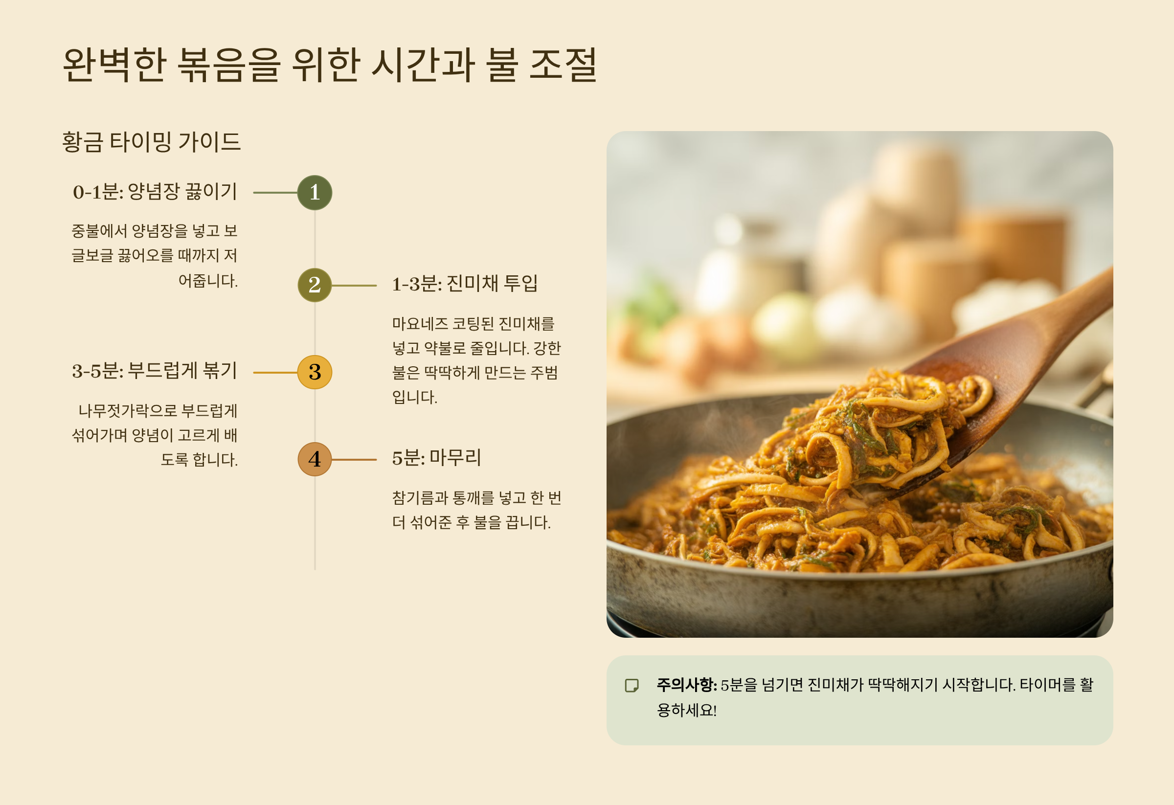 ⚠️ **주의하세요!** 진미채는 불 위에서 볶는 시간이 길어질수록 빠르게 딱딱해집니다. 잔열 활용이 핵심입니다.