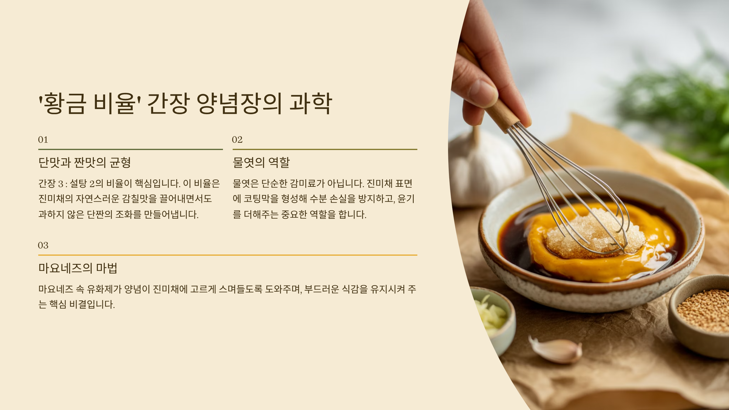 간장 진미채볶음의 맛을 결정짓는 핵심은 바로 **간장:설탕:물엿(올리고당)의 황금 비율**에 있습니다. 전문가들은 보통 간장과 당류의 비율을 **약 3:1:2**로 맞추는 것을 기본으로 합니다. 이는 단순히 단맛과 짠맛의 조화를 넘어, **진미채의 표면을 코팅**하여 수분 증발을 막고 윤기를 부여하는 과학적인 역할까지 고려한 비율입니다. 특히, 설탕은 양념을 끓일 때 진간장의 짠맛을 중화시키고 풍미를 더하며, 올리고당(혹은 물엿)은 **마지막 단계에서 불을 끈 후** 잔열로 버무려야 끈적임 없이 깔끔한 윤기를 유지할 수 있습니다. 다진 마늘은 양념을 끓일 때 함께 넣어 마늘의 향을 오일에 먼저 입혀주는 '마늘 기름' 역할을 하게 하여 잡내를 잡고 깊은 감칠맛을 끌어올립니다.