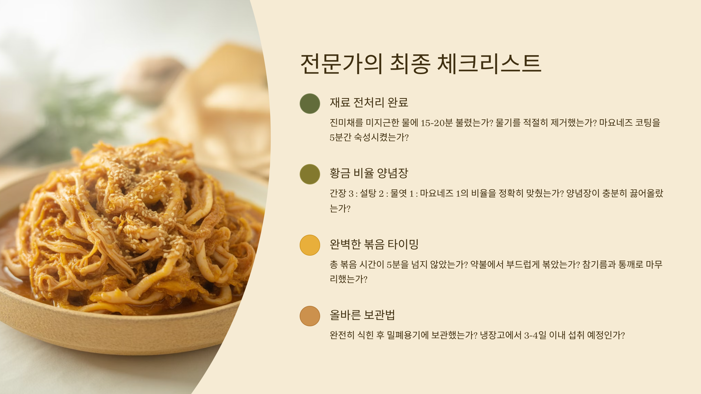 지금까지 부드러운 간장 진미채볶음을 완성하기 위한 모든 핵심 정보를 다루었습니다. 성공적인 반찬을 위한 가장 중요한 원칙은 **'진미채의 섬유질 손상 최소화'**와 **'수분 증발 방지'**입니다. 이 두 가지 목표를 달성하기 위해 **마요네즈 코팅, 양념장 최소 시간 끓이기, 불 끈 후 잔열 버무리기, 올리고당 마무리** 등의 전문적인 테크닉을 적용했습니다. 이 모든 과정을 숙지하고 최종 점검표를 활용하여 조리에 임한다면, 시간이 지나도 딱딱해지지 않고 윤기가 좌르르 흐르는 완벽한 **간장 진미채볶음**을 완성할 수 있을 것입니다. 이제 이 레시피는 여러분의 식탁에서 **가장 전문적이고 신뢰할 수 있는 밑반찬**으로 자리매김할 것입니다.