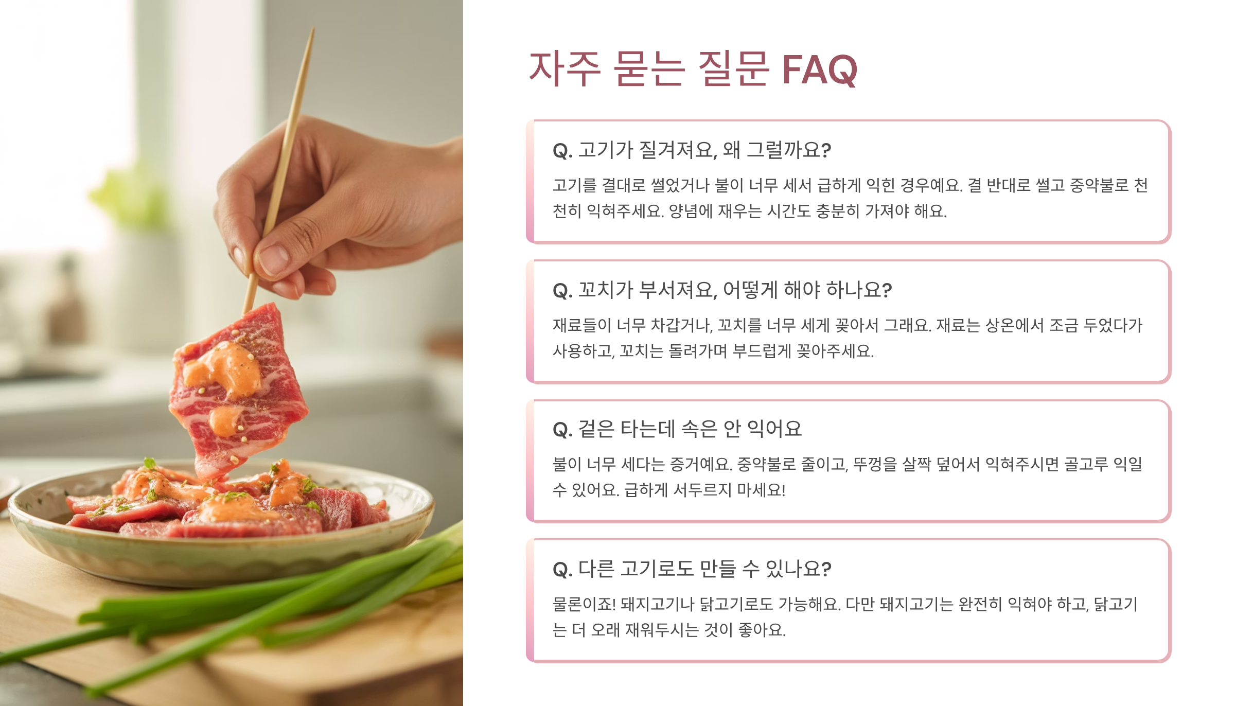 소고기 산적꼬치는 단순한 명절 음식을 넘어, 정성과 노하우가 집약된 전통 요리입니다. 이 가이드에서 제시한 재료 준비의 과학부터 황금 양념 비율, 그리고 굽는 온도 조절의 기술까지 모두 활용하셔서, 올 명절에는 더욱 맛있고 풍성한 식탁을 완성하시길 바랍니다. 완벽한 산적꼬치 만들기에 도전하세요! 궁금한 점이 있다면 언제든지 댓글로 물어봐주세요. 😊