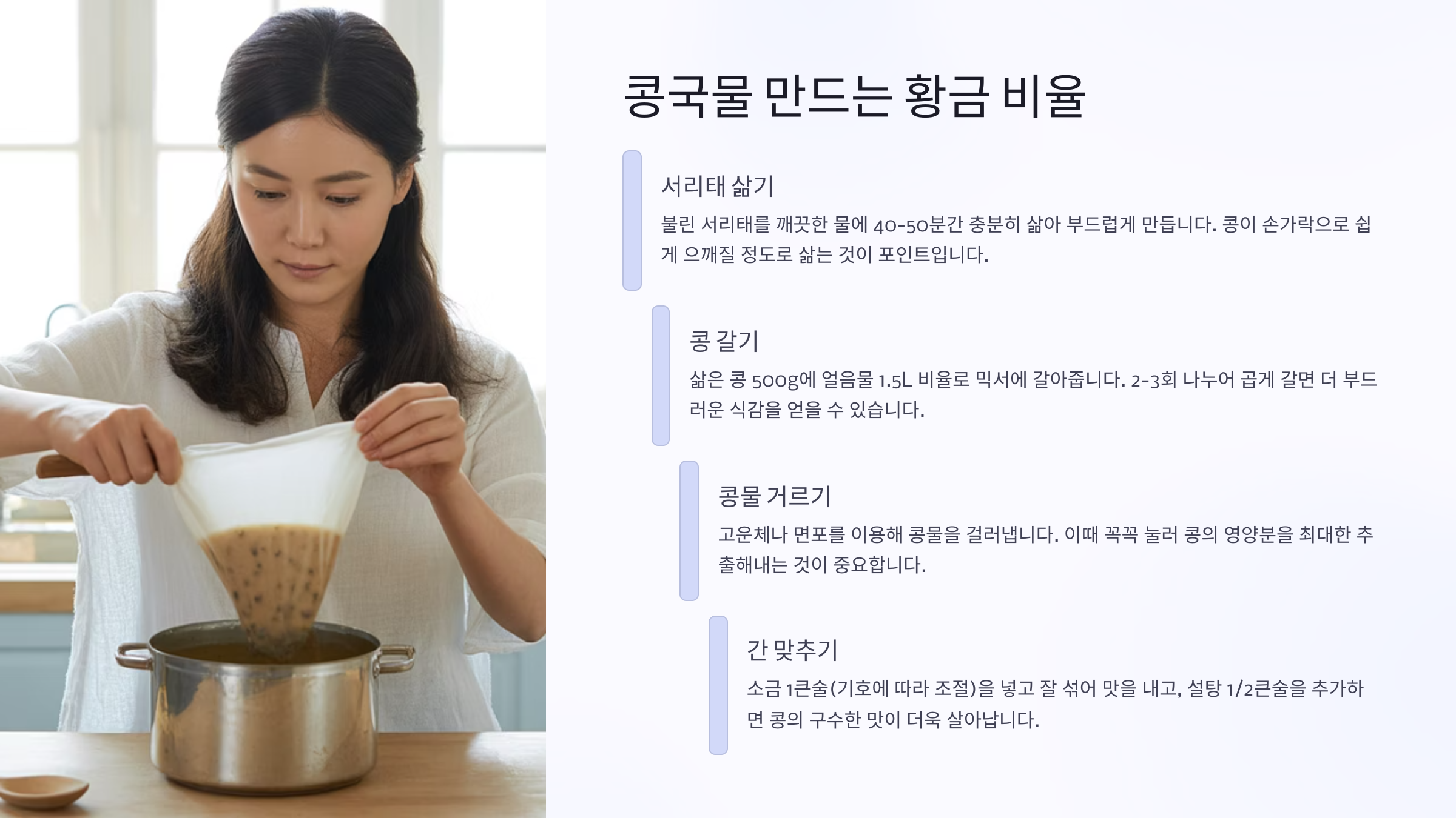 이제 콩국물 만드는 과정과 꿀팁을 알려줄게요. 고소한 콩국물은 콩을 얼마나 잘 갈고 우려내느냐에 따라 맛이 달라져요!