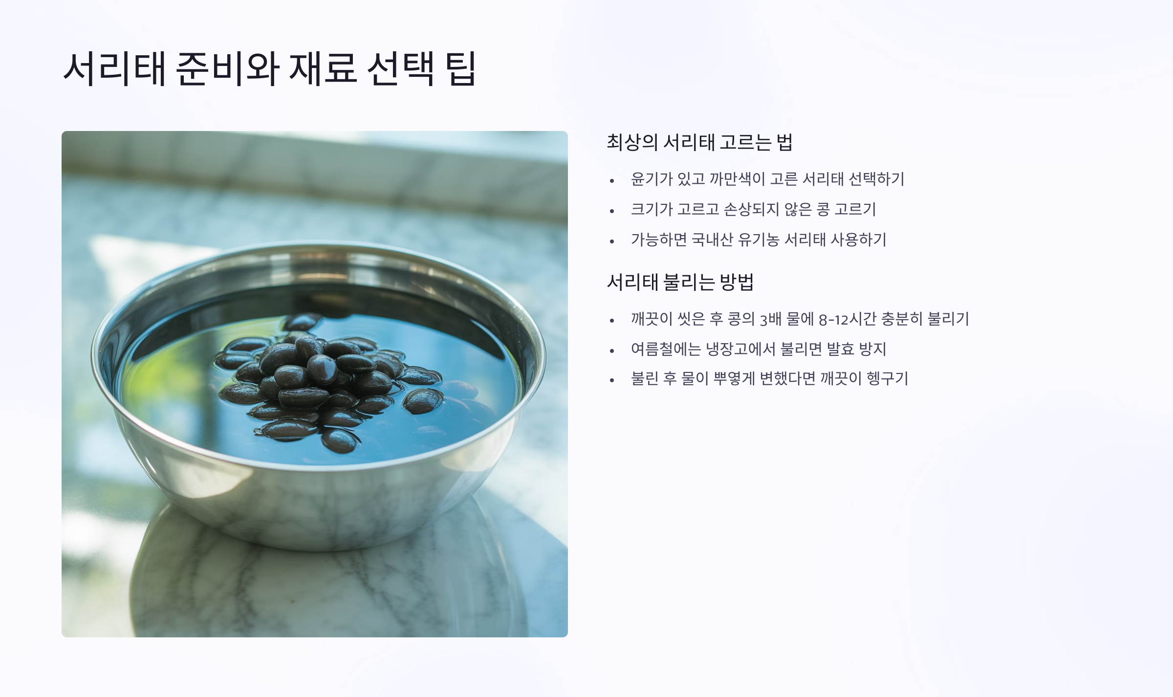 | 서리태 | 8시간 이상 불리기 | 콩국물 고소함 결정 |