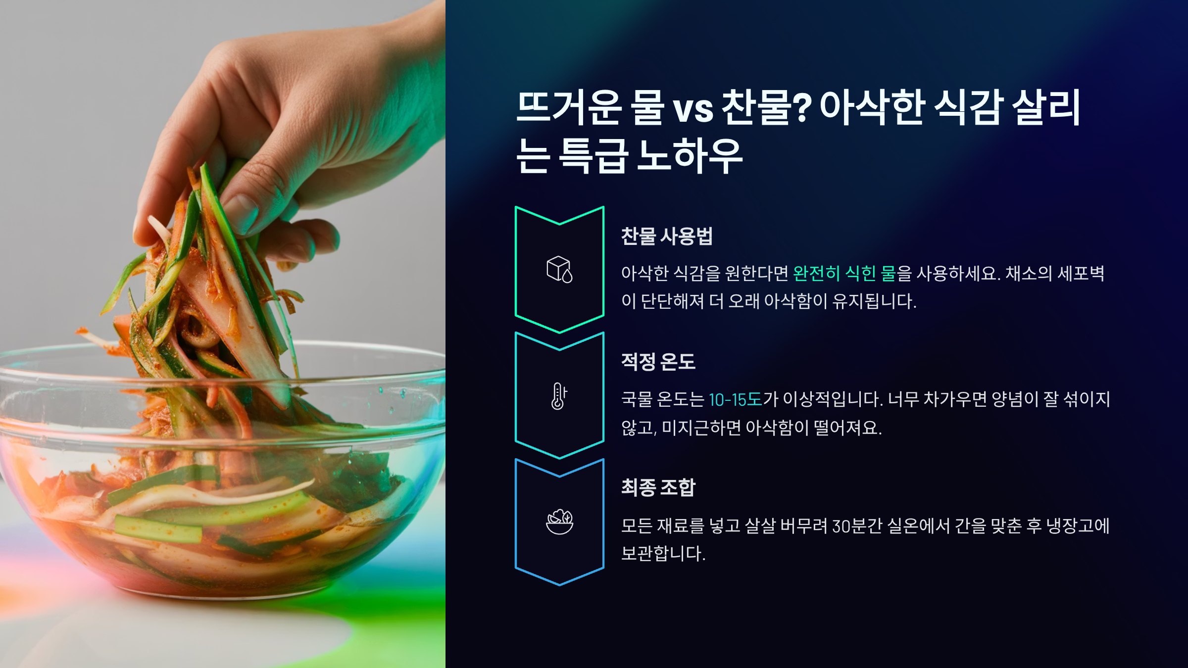 핵심 강조 1 (아삭함): 뜨거운 물(70~80℃)을 먼저 부어 열충격 주기!