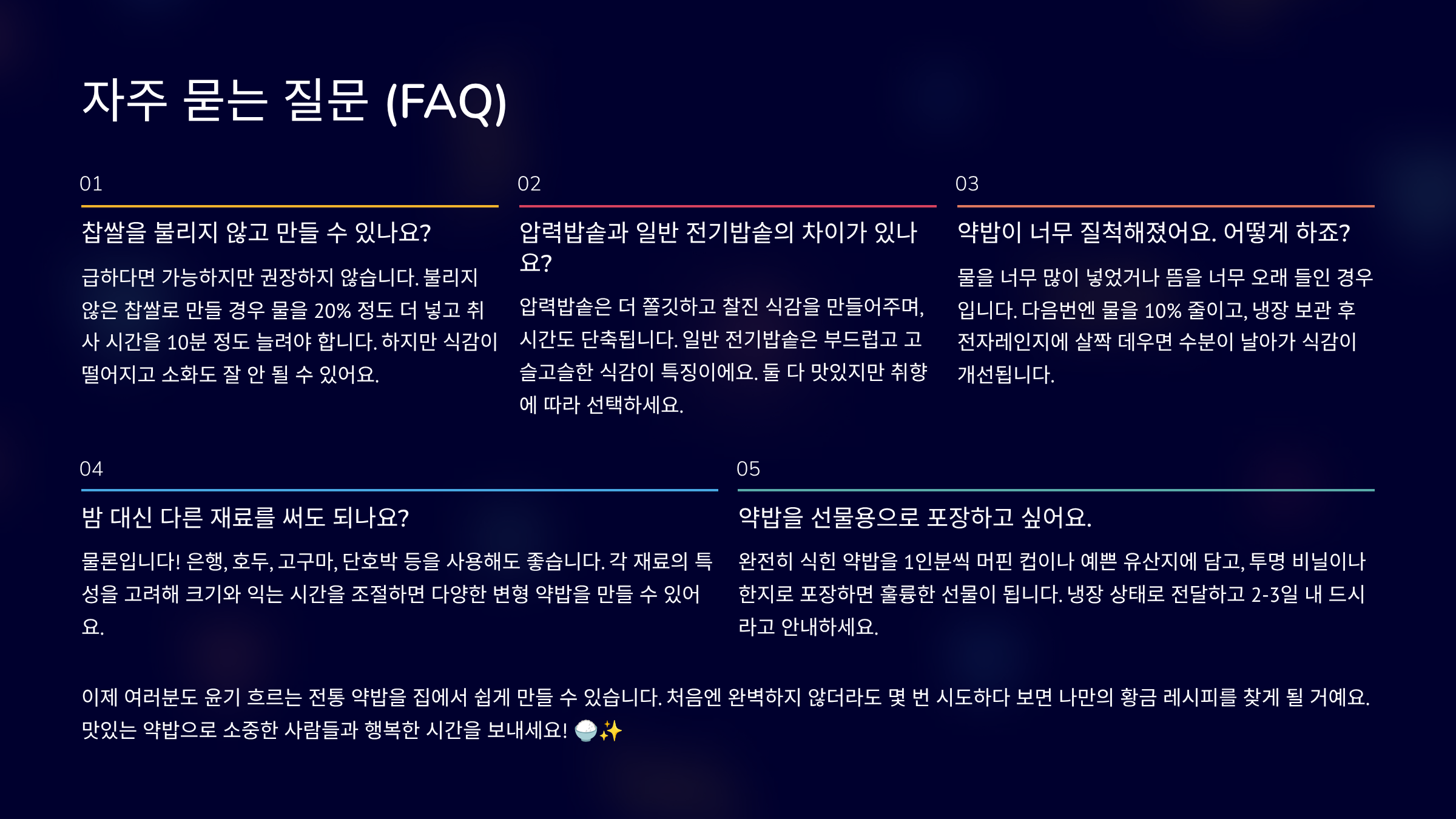 이제 전기밥솥 찹쌀 약밥 만들기의 모든 비밀을 알게 되셨습니다. 복잡하게 생각했던 전통 약식도 최신 레시피와 핵심 팁만 있다면 실패 없이 완벽하게 만들 수 있습니다. 쫀득한 찰기와 깊은 풍미가 살아있는 약밥으로 가족과 소중한 사람들에게 행복한 맛을 선물해 보세요! 더 궁금한 점이 있다면 댓글로 물어봐주세요~ 😊
