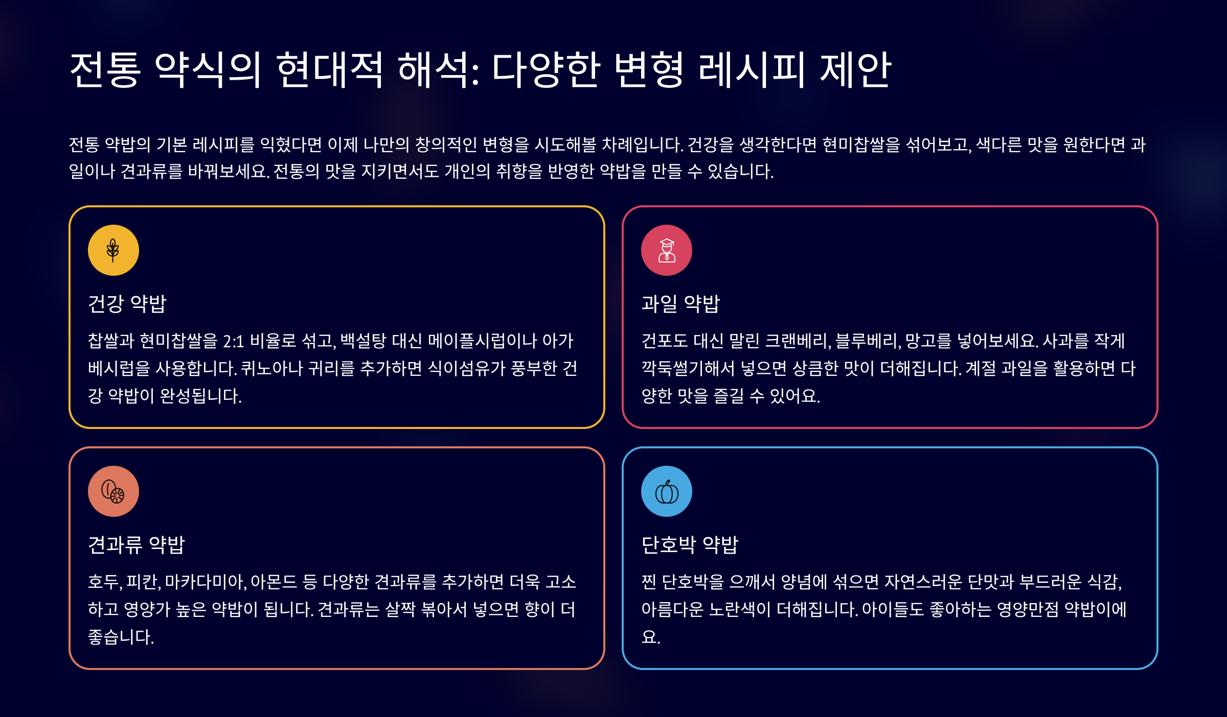 이러한 변형 레시피들은 전통 약밥이 가진 깊은 맛은 유지하면서, 새로운 트렌드를 반영하여 더욱 폭넓은 독자층에게 어필할 수 있는 장점을 가집니다. 여러분도 자신만의 시그니처 약밥을 개발해보세요.