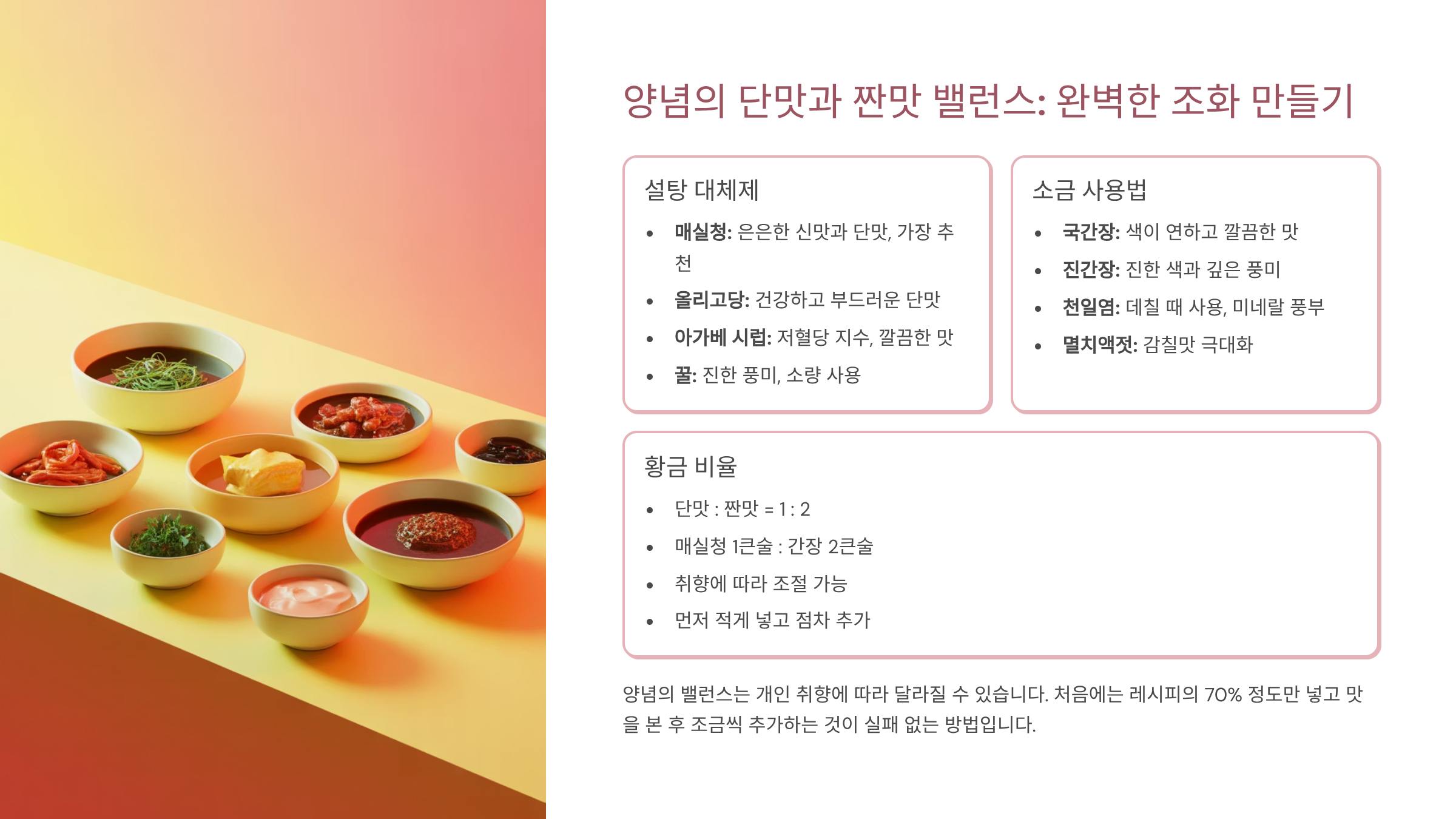 양념의 '단맛'과 '짠맛' 밸런스: 설탕 대체제와 소금 사용법 🧂