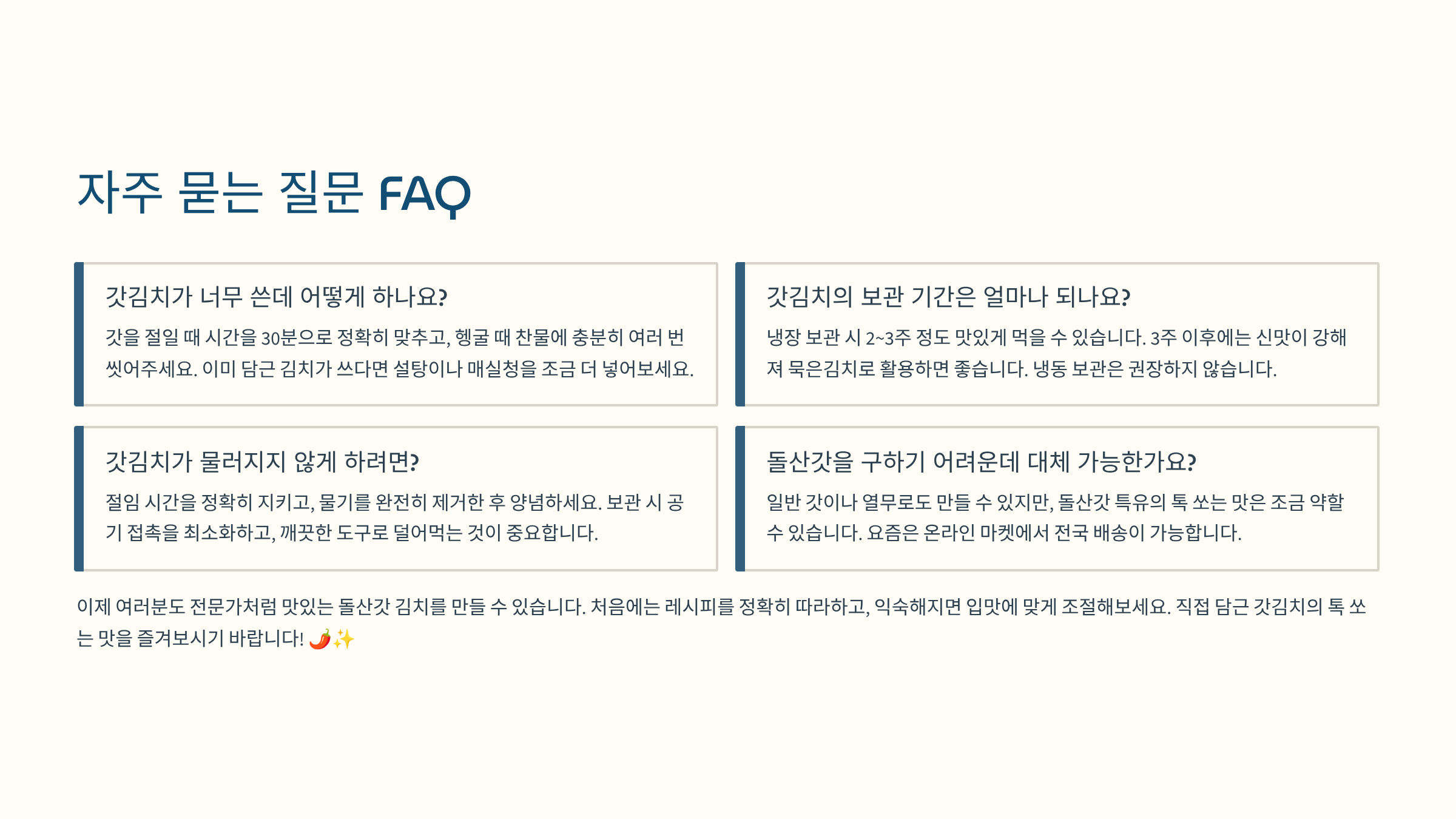 지금까지 **여수 돌산갓 김치 담그기**의 모든 과정을 과학적이고 전문적인 시각으로 살펴보았습니다. 좋은 재료 선정부터 절임, 황금 양념 비율, 그리고 미생물학적 숙성 원리까지, 이 가이드의 지침을 따른다면 초보자도 실패 없이 톡 쏘는 맛과 아삭한 식감이 살아있는 명품 갓김치를 완성할 수 있습니다. 김치는 시간과 정성이 필요한 발효 과학의 결정체입니다. 이 글이 여러분의 김치 담그기에 신뢰할 수 있는 이정표가 되기를 바랍니다. 더 궁금한 점이나 여러분만의 갓김치 비법이 있다면 댓글로 나눠주세요~ 😊
