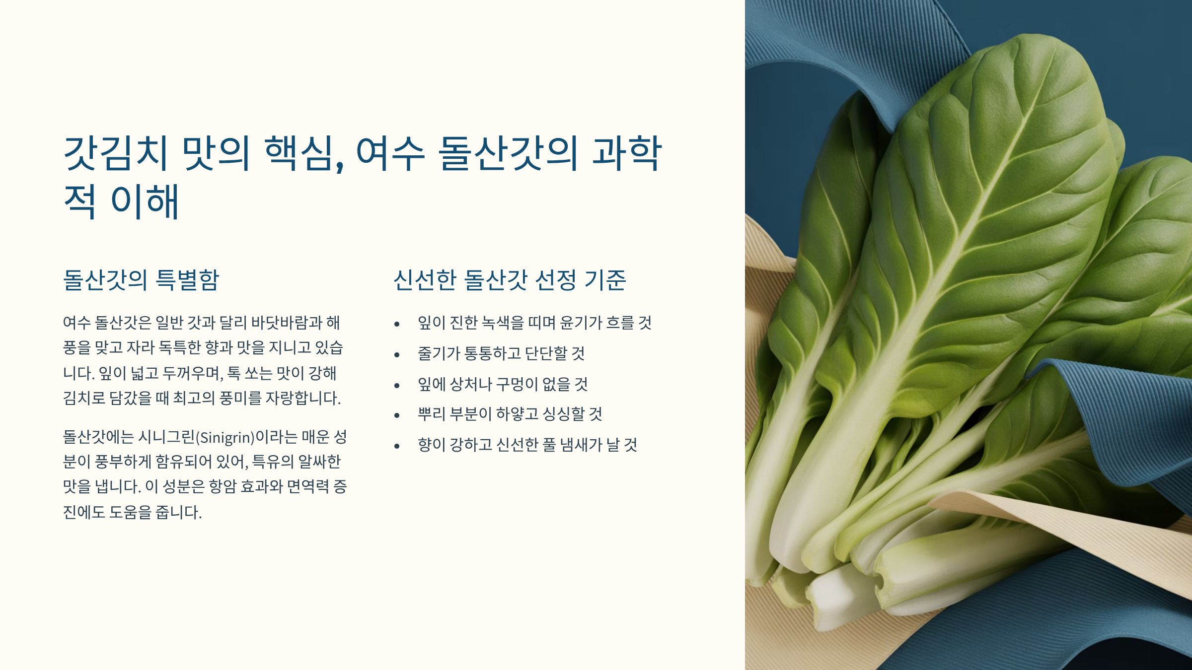 갓김치 맛의 핵심, 여수 돌산갓의 과학적 이해 및 선정 기준 🔎