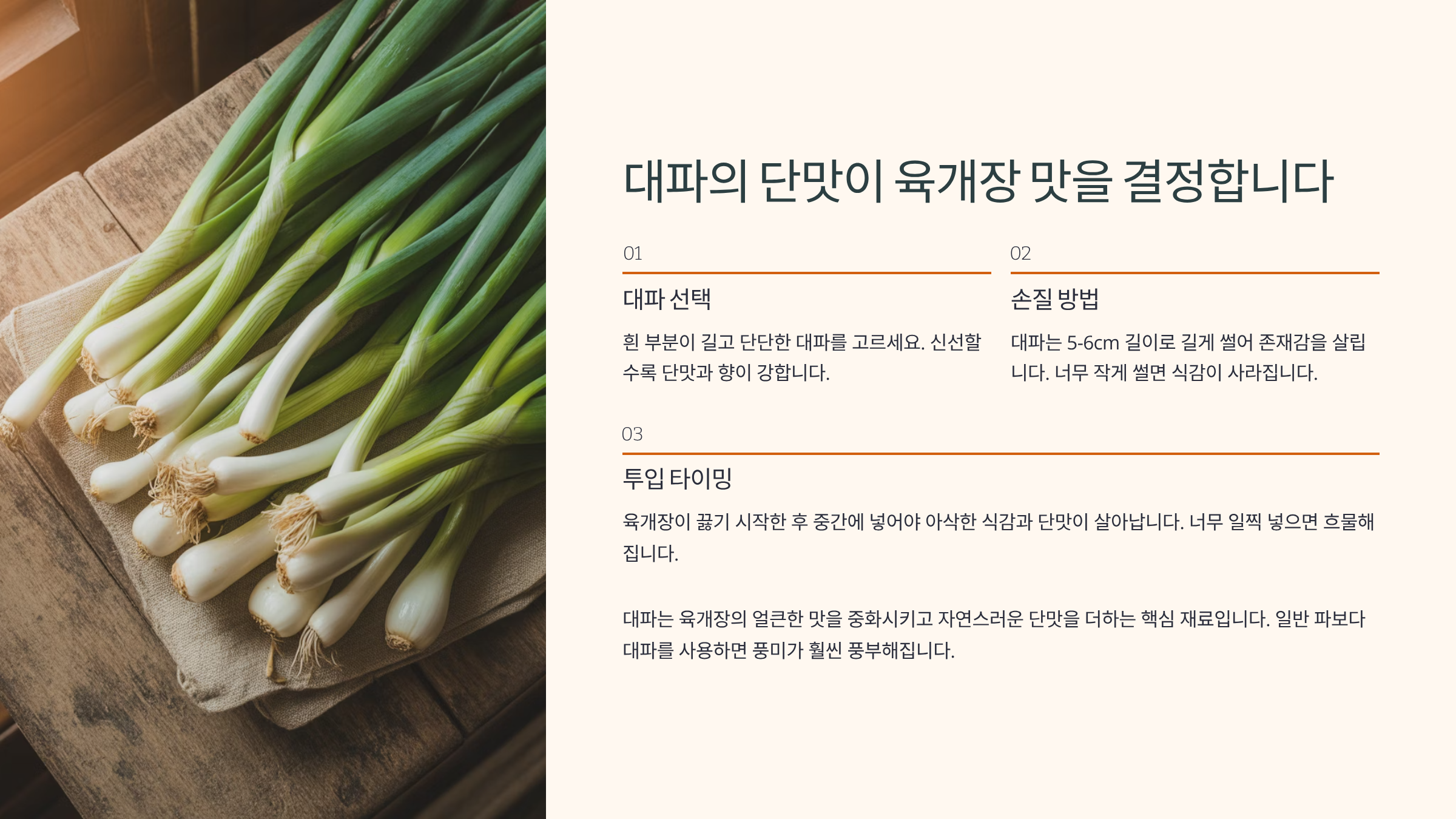 3. 대파를 활용한 단맛 최적화: 육개장의 풍미를 결정하는 비밀 🥬