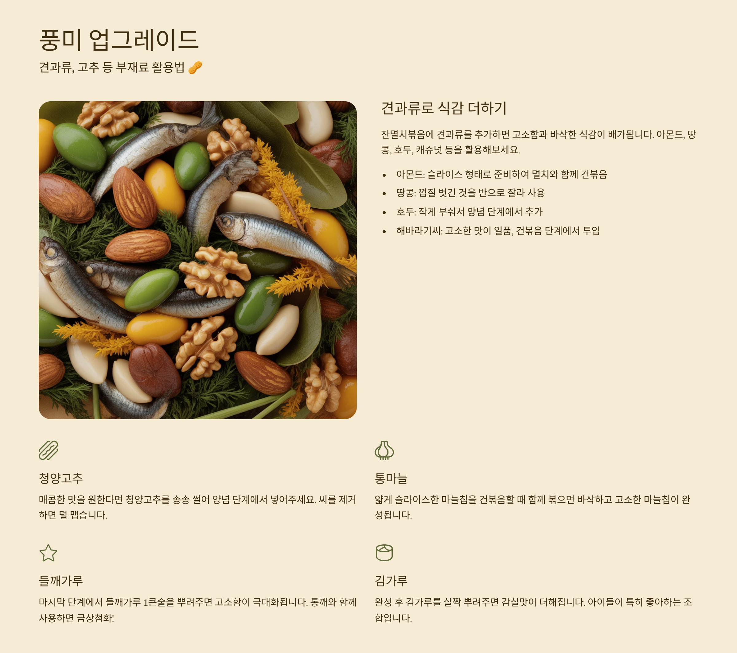 5. 풍미 업그레이드: 견과류, 고추 등 부재료 활용법 🥜