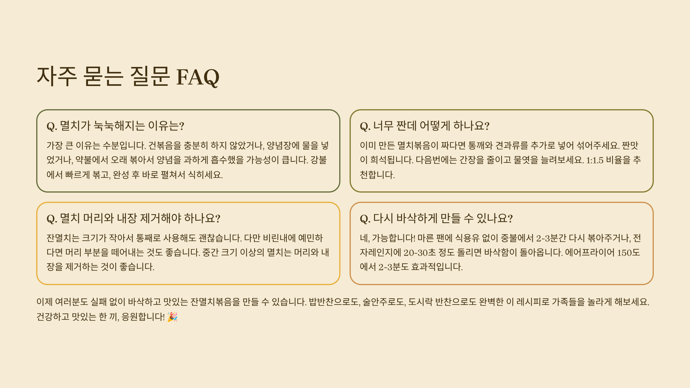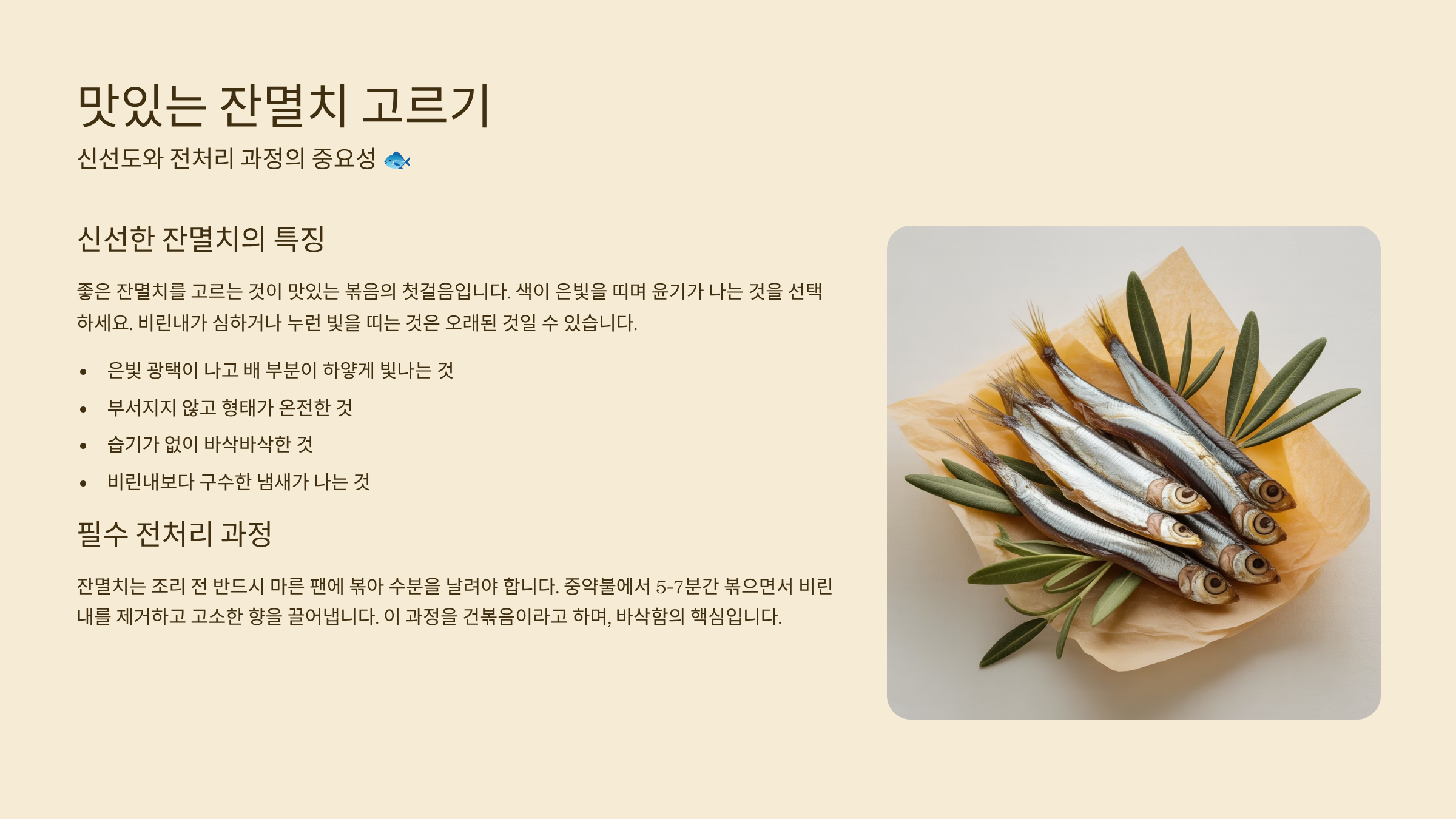 핵심 강조 1: **멸치 전처리는 바삭함의 시작** (마른 팬 볶기 + 가루 제거)