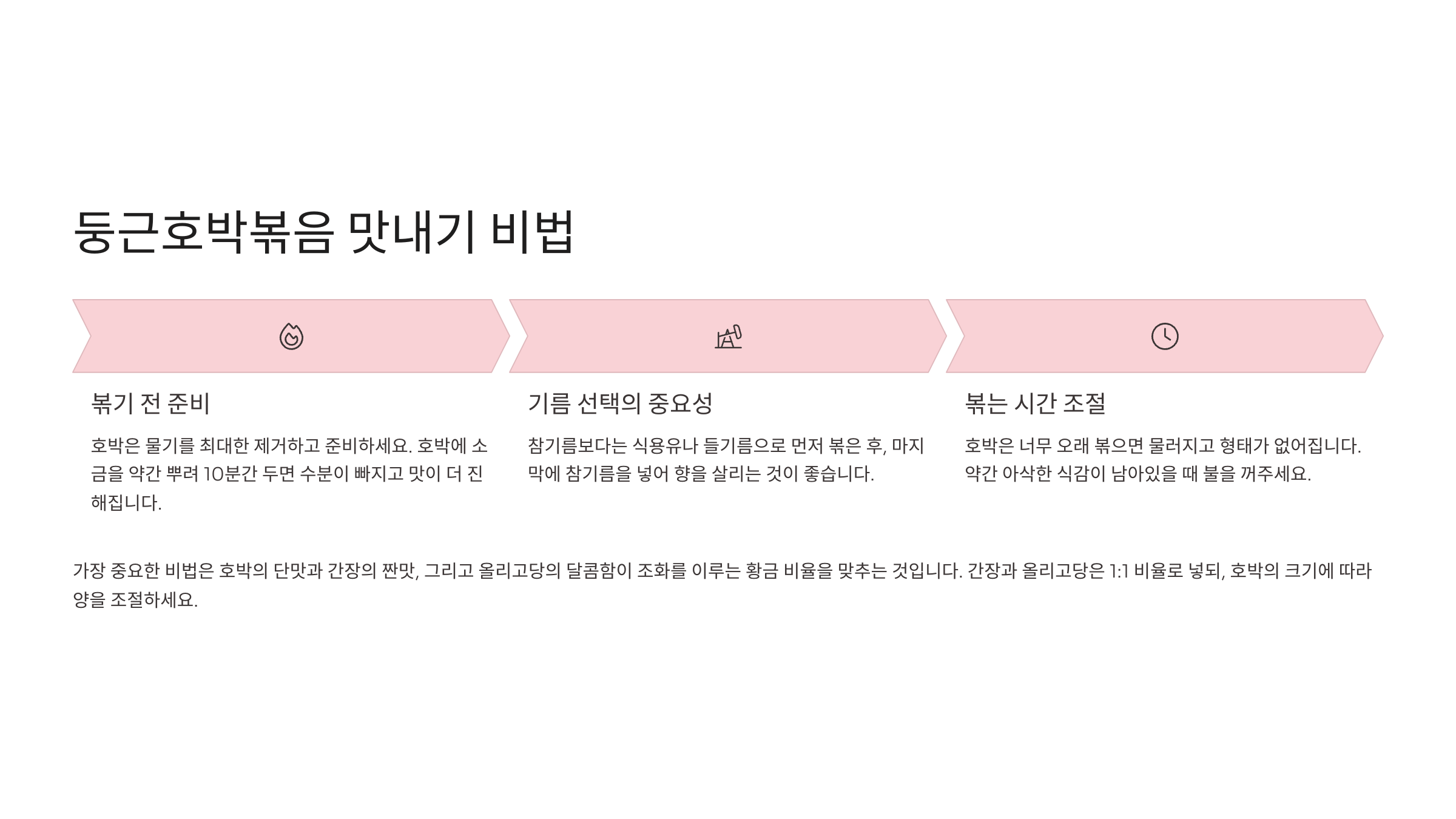 | 마늘 먼저 볶기 | 약한 불에 향내기 | 향미 증진 |