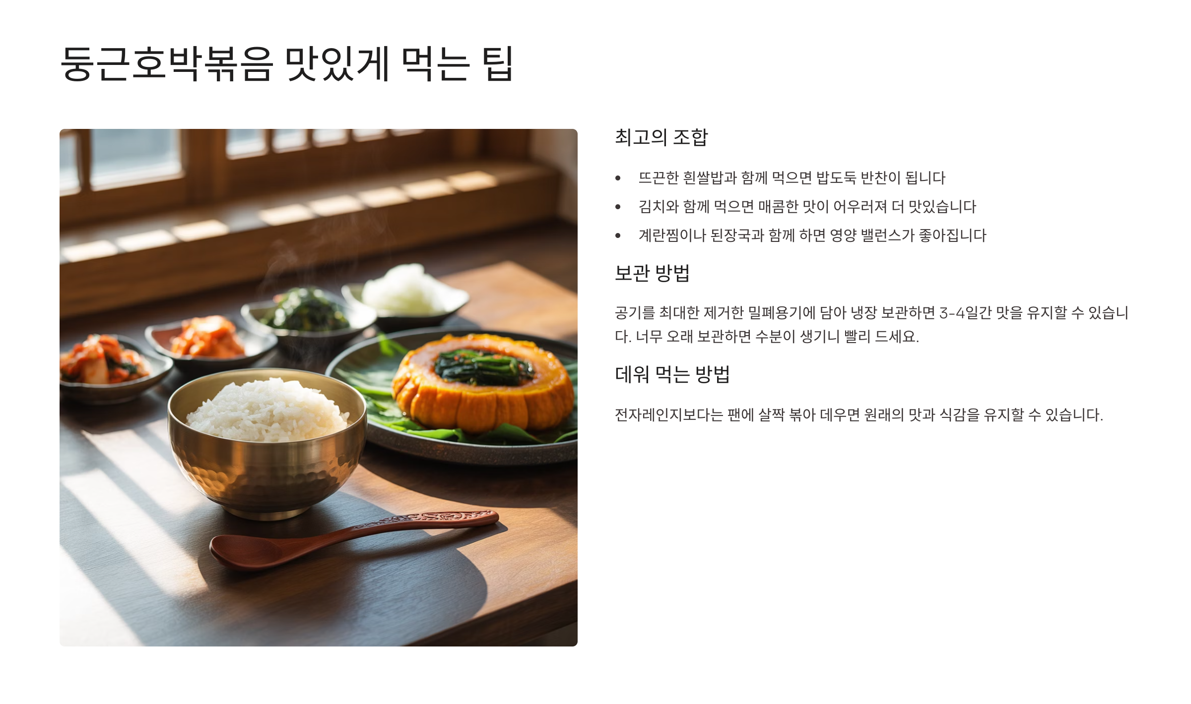 이렇게 맛있게 먹는 팁을 따라 하면 둥근호박볶음이 매일 반찬으로도 사랑받을 수 있어요. 저도 자주 활용하는 방법들이라 자신 있게 추천드려요!