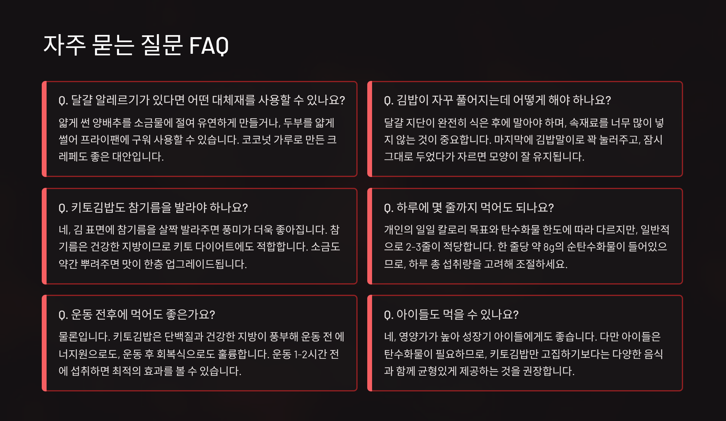 이제 **키토김밥 재료와 싸는법**에 대한 완벽한 가이드를 마쳤습니다. 밥 없이도 이렇게 맛있고 포만감 넘치는 김밥을 만들 수 있다는 사실이 놀랍지 않나요? 저탄고지 식단은 결코 맛을 포기하는 것이 아님을 기억하고, 이 레시피를 통해 건강하고 즐거운 다이어트를 이어가시길 응원합니다. 레시피를 시도해 보시고 궁금한 점이 있다면 언제든지 댓글로 물어봐주세요! 😊