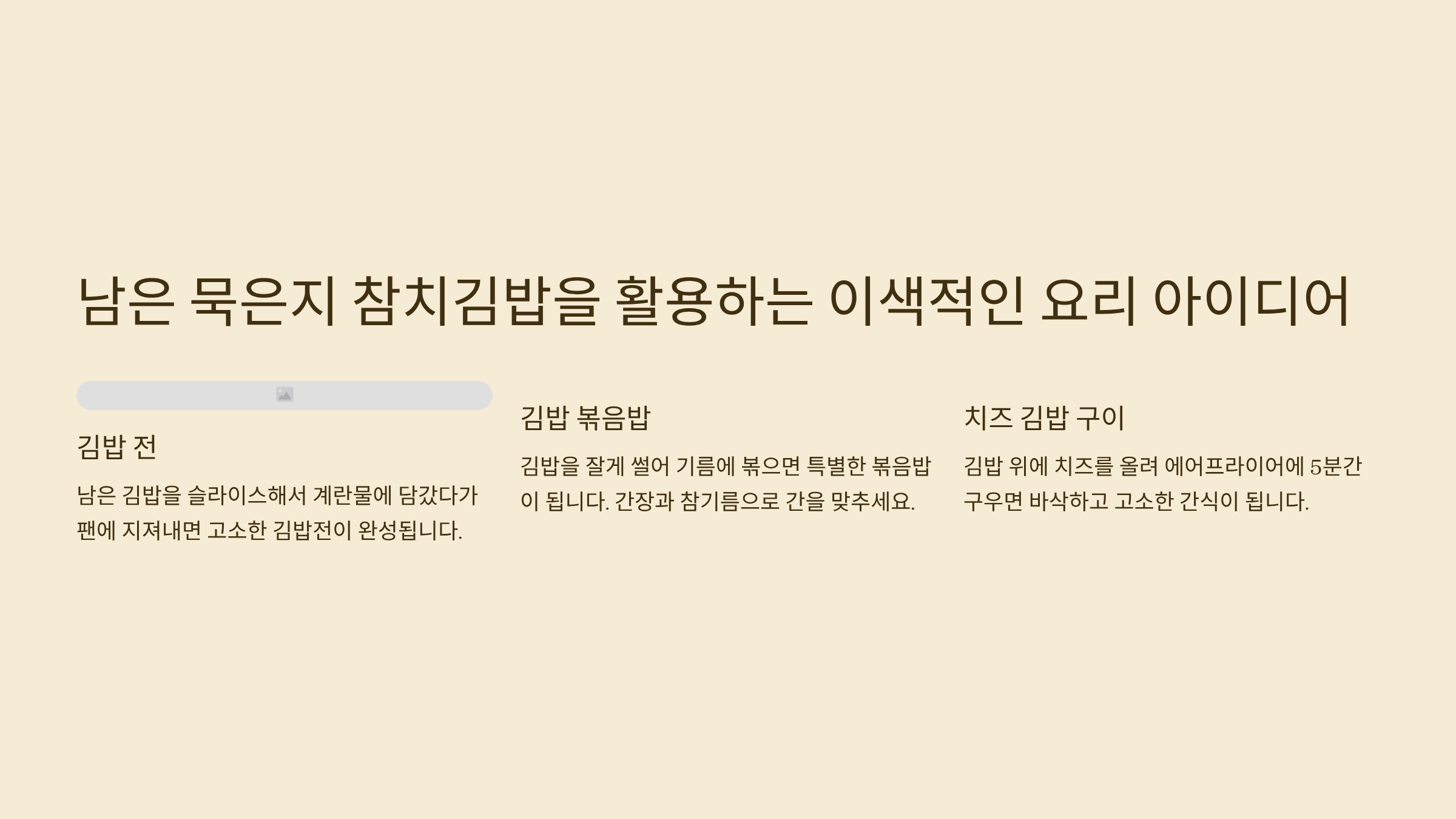 열심히 만들었지만 혹시라도 김밥이 남게 되었다면, 그냥 냉장고에 넣어두지 마세요! 시간이 지날수록 밥이 딱딱해지고 맛이 떨어지는 김밥을 **새로운 요리로 변신**시키는 것은 주부 9단들의 필수 노하우입니다. 남은 묵은지 참치김밥을 활용하는 가장 대중적인 방법은 **김밥전**입니다. 계란 물에 퐁당 담가 프라이팬에 노릇하게 구워내면, 묵은지의 산미와 계란의 고소함이 어우러져 마치 새로운 음식을 먹는 듯한 착각을 줍니다. 이때 김밥에 치즈를 살짝 올려 녹여주면 **묵은지 참치 김밥 치즈 구이**라는 프리미엄 간식이 탄생합니다. 또한, 김밥을 잘게 썰어 **김치볶음밥**에 넣어 볶거나, 육수에 넣어 **김밥 라면**으로 끓여 먹는 방법도 있습니다. 김밥 속의 묵은지와 참치, 그리고 양념된 밥알이 국물에 풀리면서 깊은 감칠맛을 더해주어, 평범한 라면이나 볶음밥과는 비교할 수 없는 특별한 맛을 선사합니다. 냉장 보관된 김밥은 전자레인지에 돌리지 않고, 반드시 프라이팬을 이용해 열을 가해야 밥이 꼬들꼬들하게 살아나 최고의 식감을 유지할 수 있습니다. 남은 김밥으로도 훌륭한 한 끼를 만들 수 있다는 사실, 이제 잊지 마세요! (총 406자)