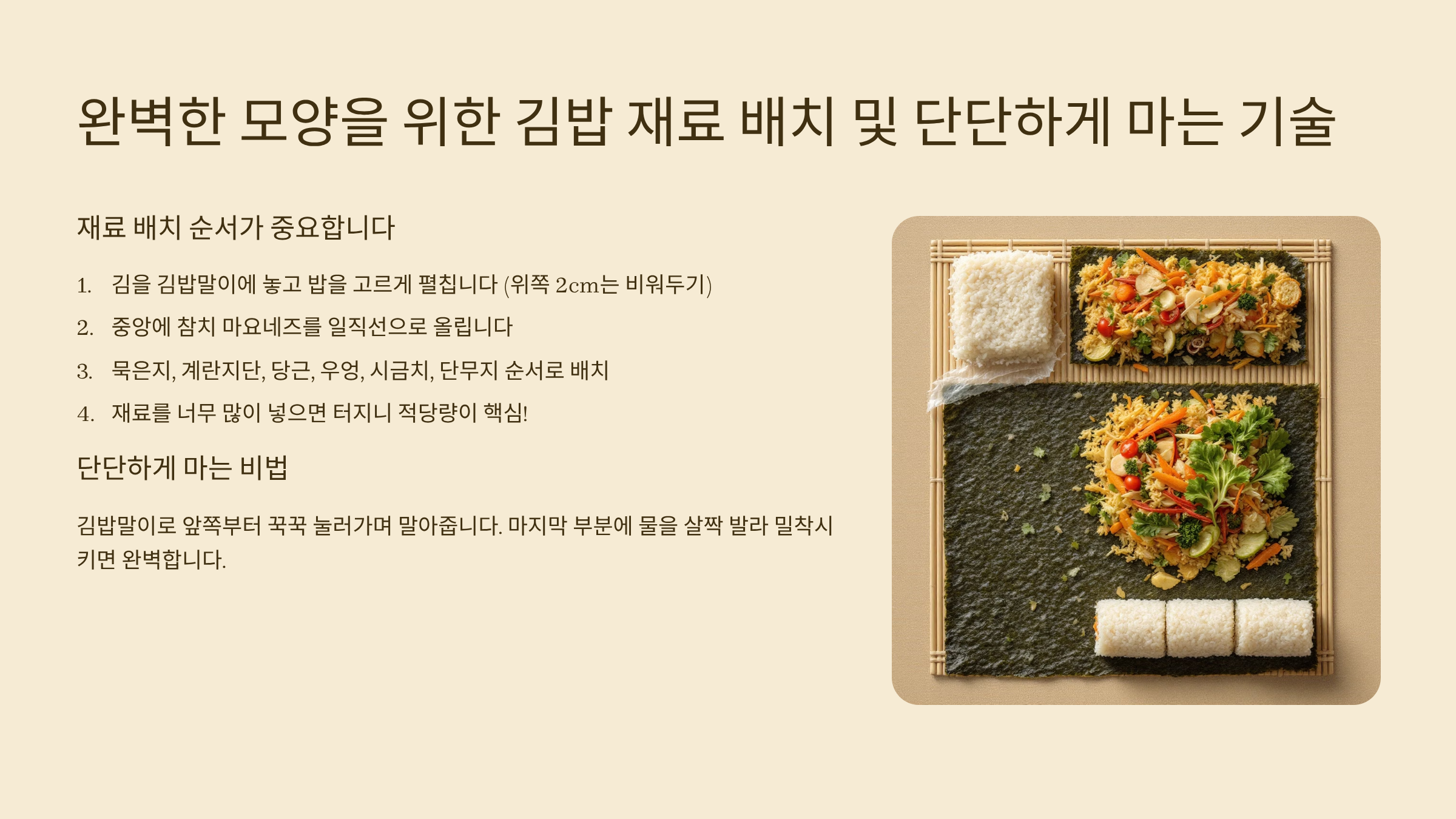 4. 완벽한 모양을 위한 김밥 재료 배치 및 단단하게 마는 기술 📐