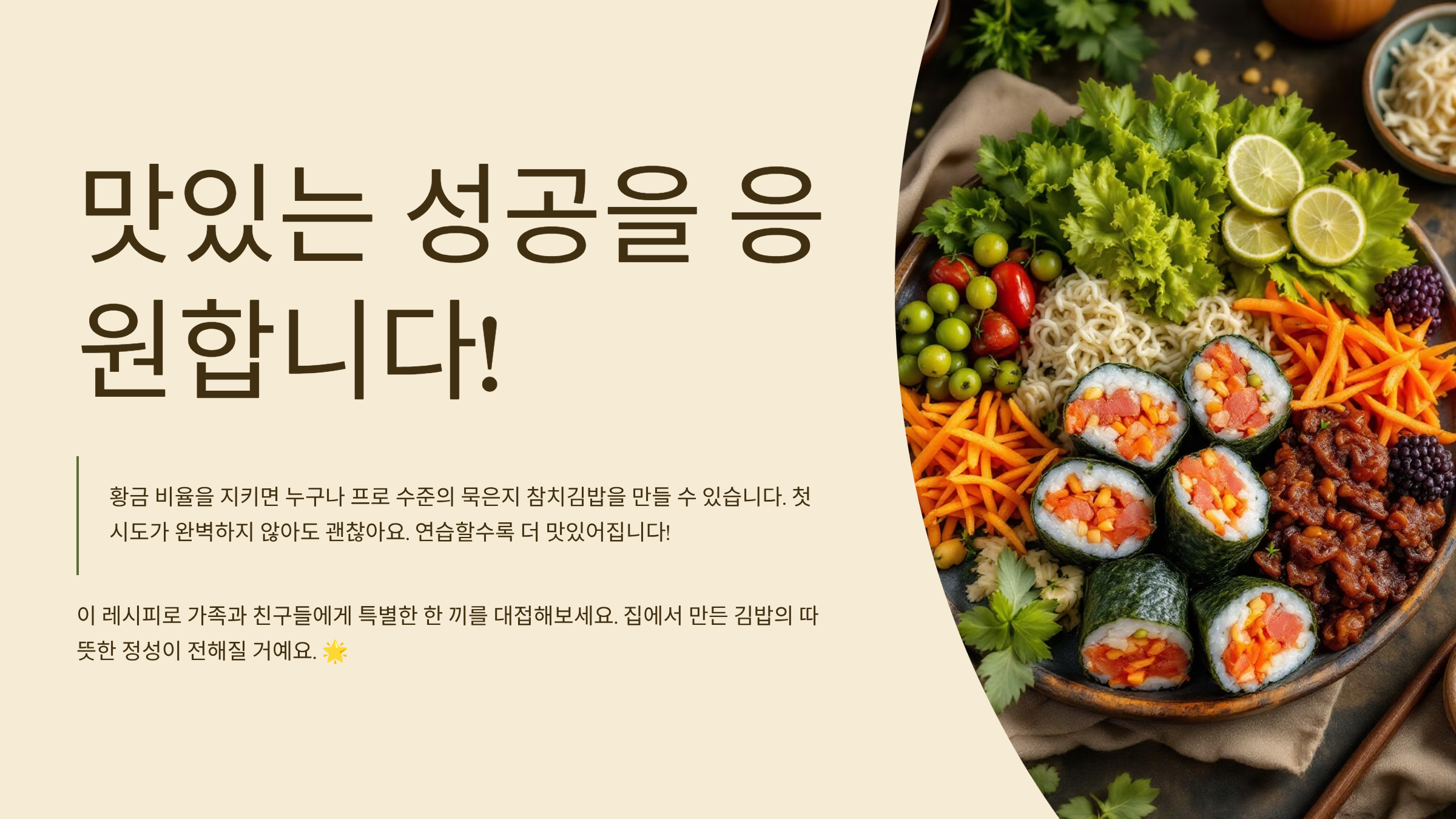 이 세 가지만 지키면 김밥 실패는 없습니다! 다음번엔 더 완벽하게 도전하세요.
