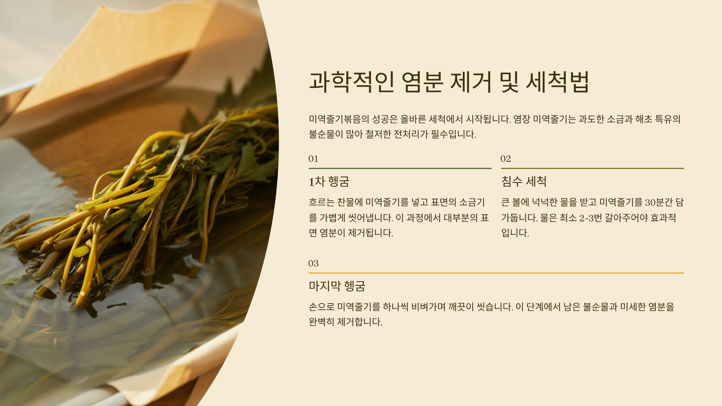 1. 미역줄기볶음 성공의 첫걸음: 과학적인 염분 제거 및 세척법 🌊