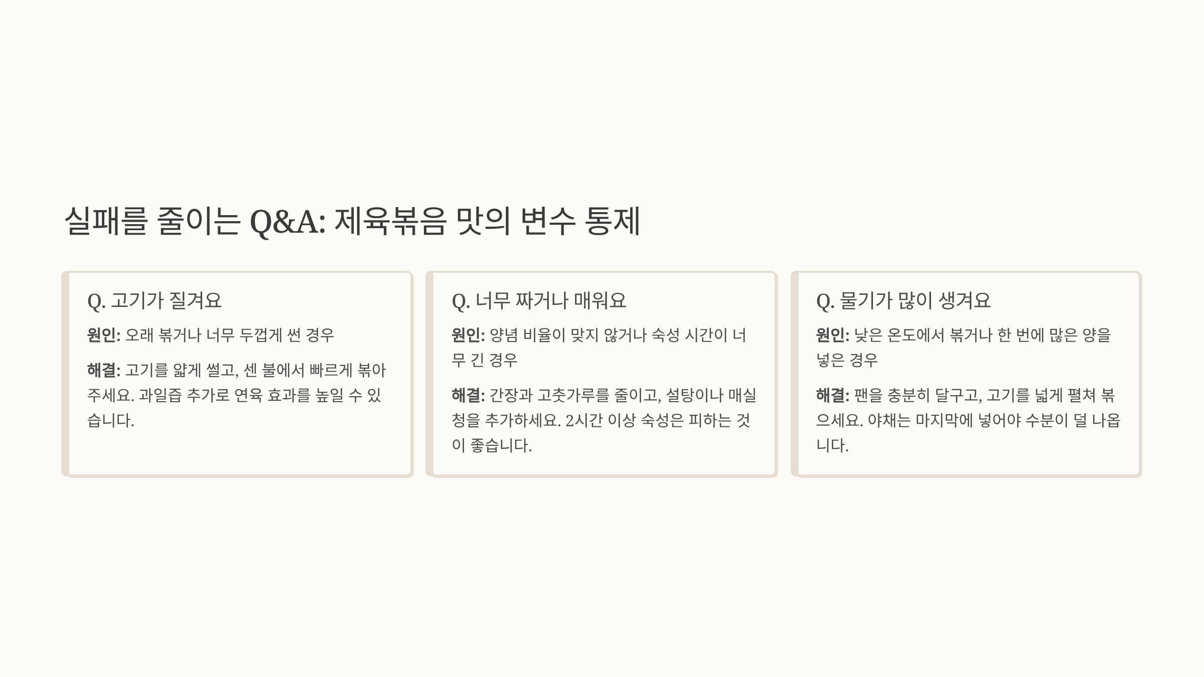 아무리 황금 레시피를 따르더라도, 재료의 신선도나 주방 환경에 따라 맛은 달라질 수 있습니다. 제육볶음 조리 시 발생하는 **가장 흔한 실패 유형 3가지**에 대한 명확한 해결책을 제시하여 맛의 변수를 통제할 수 있도록 돕겠습니다. 특히, 텁텁함이나 짠맛/단맛의 불균형은 최종 맛에 치명적인 영향을 미치므로, 아래 가이드를 통해 조리 중 실수를 즉각적으로 교정할 수 있습니다.