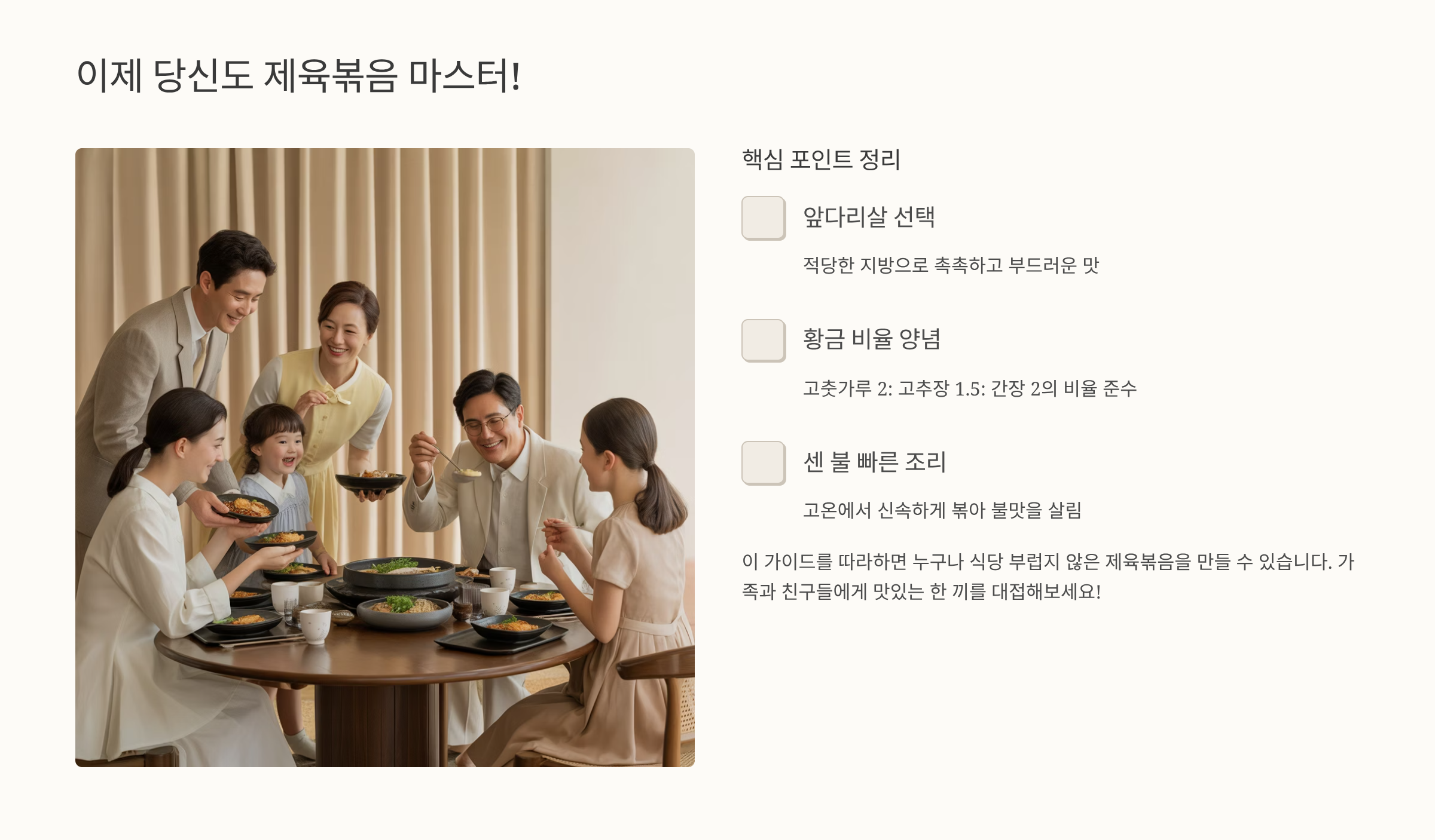 이제 **앞다리살 제육볶음 양념장** 레시피에 대한 모든 궁금증이 해소되셨기를 바랍니다. 이 전문 가이드를 통해 여러분의 식탁에 올라가는 제육볶음이 한 단계 더 업그레이드되기를 기대합니다. **황금 비율과 볶음 기술**을 숙지하시어 최고의 맛을 경험하세요! 😊 더 궁금한 점이 있다면 댓글로 물어봐주세요~