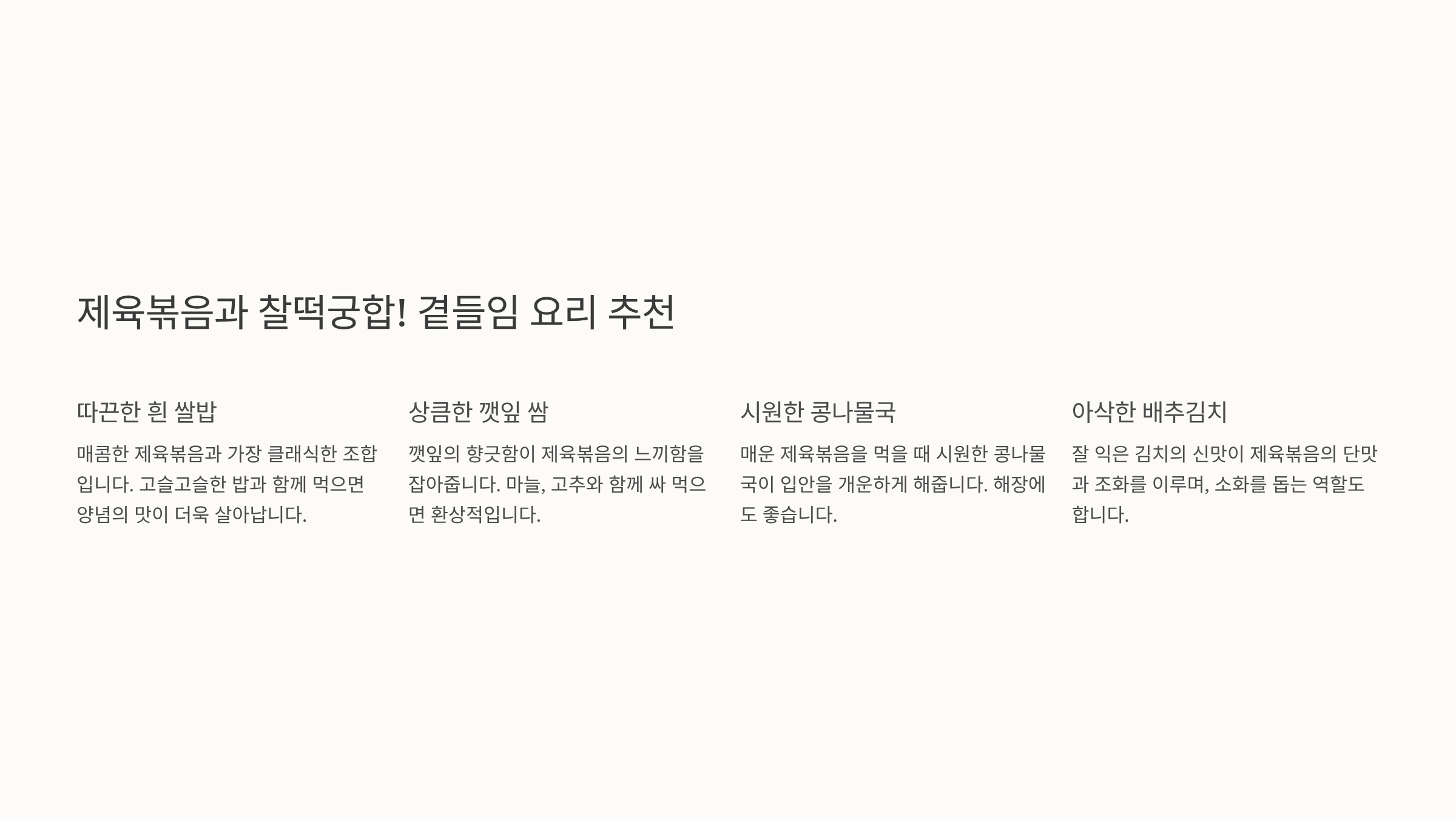 * 곁들임 메뉴 선택 시, 간이 강하지 않은 메뉴를 선택하여 제육볶음의 주연 자리를 침범하지 않도록 주의합니다.