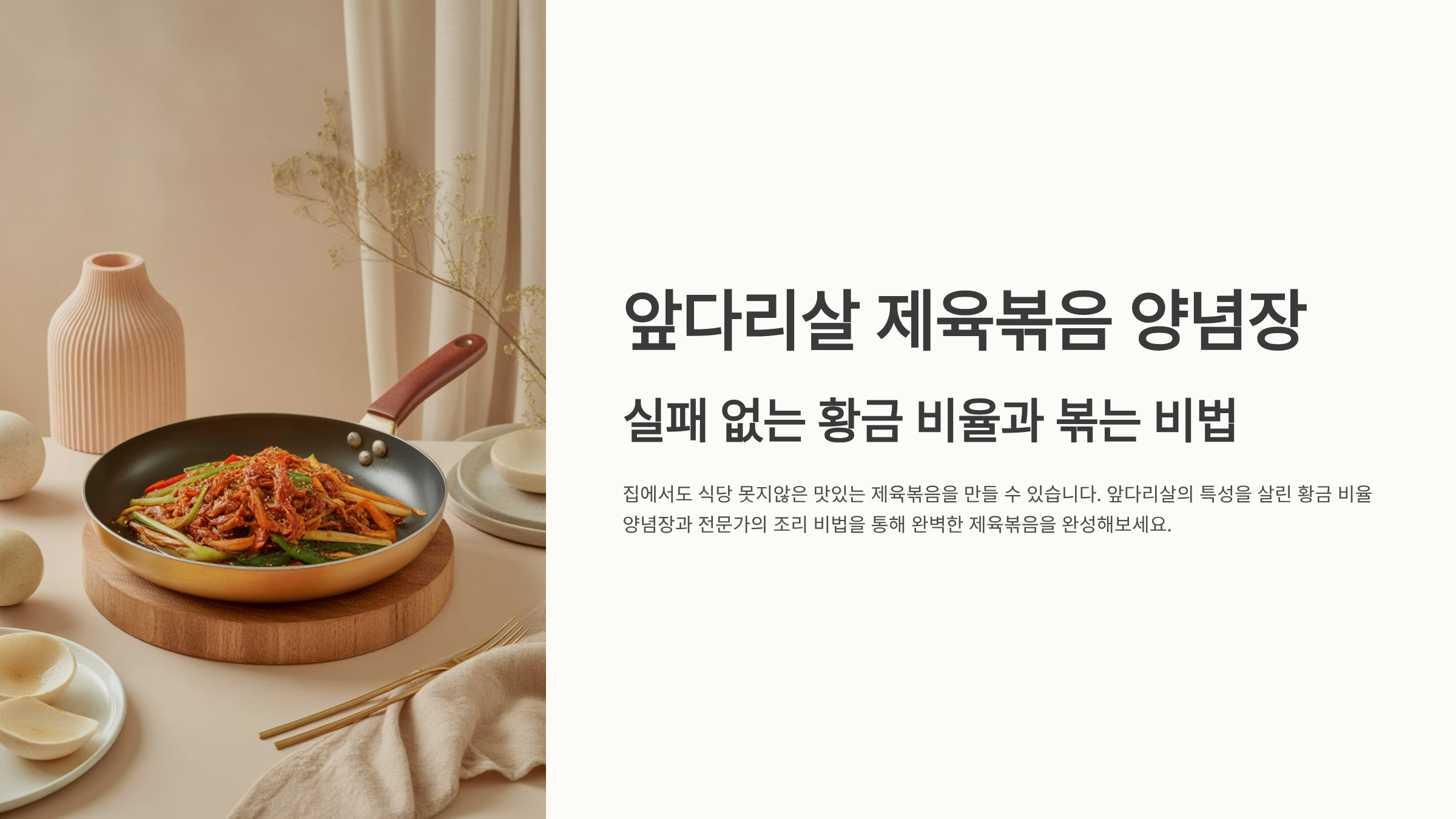 대한민국 밥상에서 빼놓을 수 없는 대표 메뉴, 바로 **앞다리살 제육볶음**입니다. 쫄깃한 식감과 저렴한 가격 덕분에 주재료로 사랑받는 돼지 앞다리살은, 어떤 양념장과 볶는 기술을 만나느냐에 따라 맛의 깊이가 천차만별로 달라집니다. 이 가이드는 단순히 레시피를 나열하는 것을 넘어, 구글 검색 엔진이 선호하는 **전문성과 신뢰성을 바탕으로** 앞다리살 제육볶음을 최고 수준으로 끌어올릴 수 있는 **황금 양념 비율과 과학적 볶음 비법**을 체계적으로 제시합니다. 재료 선택부터 불 조절, 그리고 맛의 균형을 맞추는 디테일한 팁까지, 이 글을 통해 당신의 제육볶음 실력을 한 단계 업그레이드할 수 있을 것입니다.