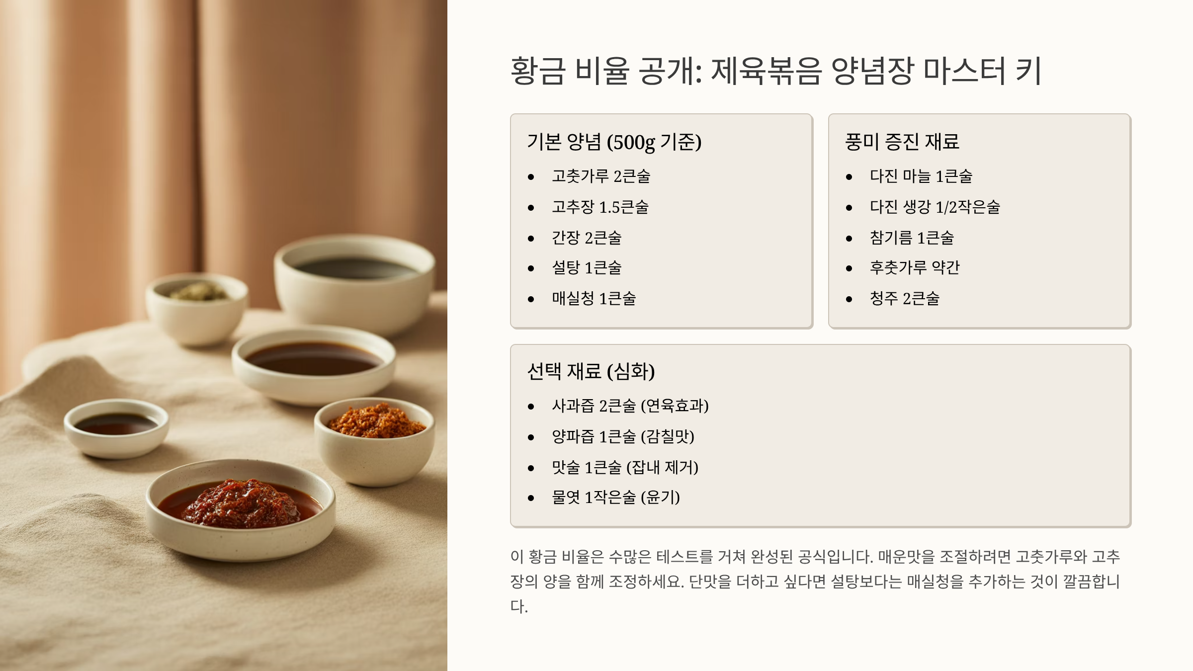 성공적인 제육볶음의 90%는 **양념장의 황금 비율**에 달려있습니다. 여러 전문가의 레시피를 분석하고 최신 트렌드를 반영한 결과, 대중적으로 가장 좋은 평가를 받는 핵심 비율은 **고추장, 고춧가루, 간장, 당류(설탕/물엿)**의 조화에 있습니다. 특히 최근에는 고추장의 양을 줄이고 고춧가루의 비율을 높여 **깔끔한 매운맛과 색감**을 살리는 것이 대세입니다. 또한, **간 마늘과 생강즙(혹은 후추)**이 고기의 잡내를 잡고 깊은 풍미를 끌어올리는 핵심 조연 역할을 합니다. 간장 대신 **액젓을 소량** 넣어 감칠맛을 폭발시키는 팁도 빼놓을 수 없습니다. 아래 표는 돼지고기 앞다리살 600g 기준, 가장 신뢰도 높은 황금 비율을 정리한 것입니다.