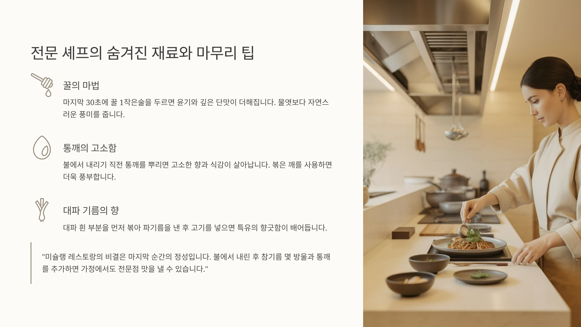 평범한 제육볶음을 일류 요리로 만드는 것은 **마지막 1%의 디테일**에 달려있습니다. 전문 셰프들이 공개를 꺼려하는 **숨겨진 재료**는 바로 **된장**과 **춘장**입니다. 된장은 고추장의 텁텁한 맛을 중화시키면서 깊은 감칠맛을 더하고, 춘장은 약 0.5 작은술 정도만 넣어도 고기의 색을 더욱 먹음직스럽게 만들고 은은한 풍미를 추가합니다. 또한, 마지막에 **불을 끄고 참기름을 두르는 것**이 일반적이지만, 셰프들은 **불을 끈 상태에서 들기름**을 소량 둘러 고소한 향을 더 높이고, **통깨 대신 볶은 검은깨**를 사용하여 시각적인 대비 효과와 깊은 고소함을 추구합니다.